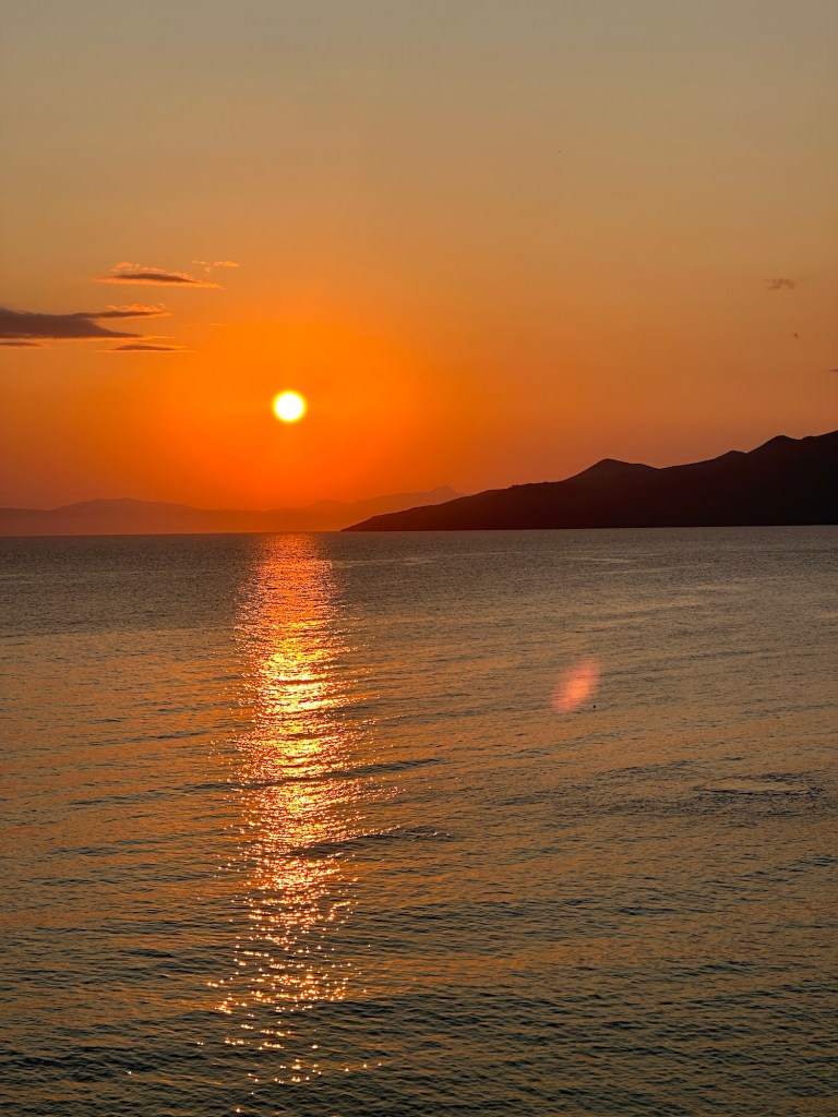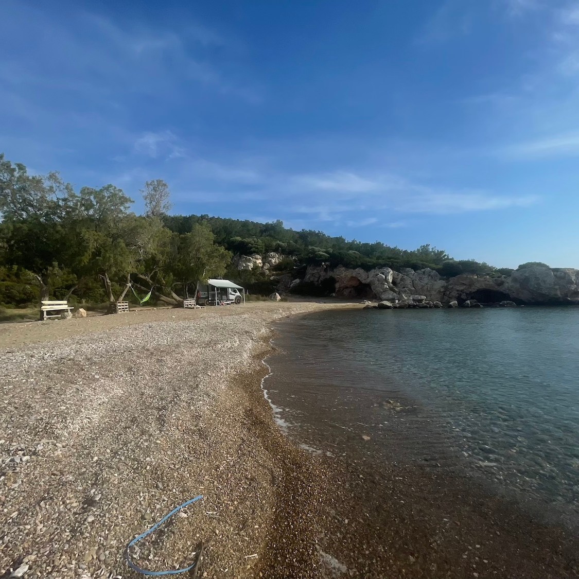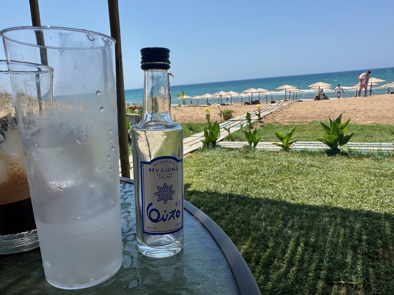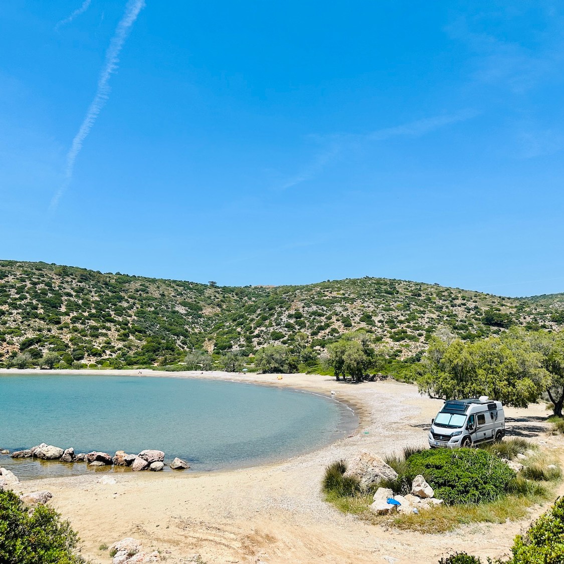 Gesehen für gut befunden und für zwei Nächte geblieben. :). Erst mal kauften wir ein Eis und zwei Cafés, alles war lecker und alle waren sehr freundlich. Dann fragten wir, ob es möglich sei, hier eine Nacht mit dem Camper zu stehen. Man muss wissen, dass Wildcampen in Griechenland verboten ist, sprich man darf kein Campingverhalten zeigen. Also keine Stühle usw. rausstellen. Der Besitzer sagte uns, „klar, bleibt hier“. Wenn wir an einer Bar stehen dürfen, ist es für uns selbstverständlich, dort einen gewissen Umsatz zu machen und Trinkgeld zu geben. Wir fühlten uns von Anfang an sehr wohl und der Besitzer und seine Familie waren auch super nett zu uns. Fleur bekam Wasser und Saft 2 Tage lang geschenkt. Wir vom Onkel des Besitzer Ouzo und vom Besitzer selbst, Chips und Cocktails. Als wir uns verabschiedet haben, packte die Mama des Besitzer uns noch 3 Flaschen Wasser und eine Tüte Chips als Wegzehrung in eine Tasche ein…da kann man sich doch echt nur Wohlfühlen.