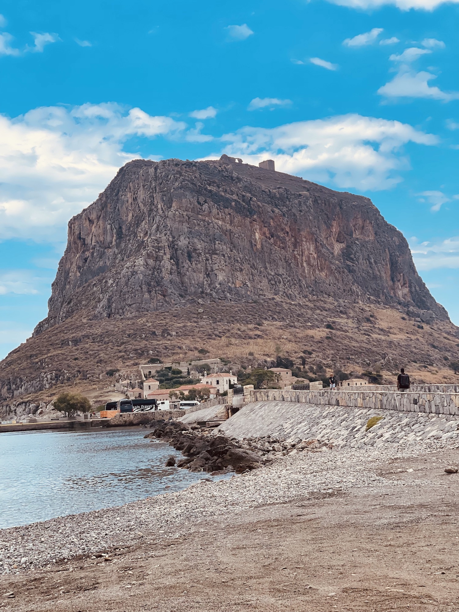 In Monemvasia angekommen parkten wir am Hafen, wo wir auch übernachtet haben. Mit den Rädern fuhren wir einen steilen Berg hinauf, um uns die mittelalterliche Stadt anzusehen. Die Spannung steigt bis zu letzt – denn die alte Stadt ist nicht einsehbar. Sesam öffne dich! Als wir durch das verwinkelte Steintor durch waren, eröffneten sich die kleinen Gassen. Wir spazierten vorbei an vielen kleinen Läden, Cafés und Tavernen. In einer davon haben wir zu Abend gegessen und hatten eine tolle Aussicht. Monemvasia ist eine bezaubernde kleine Stadt, die auf einem Felsen vor der Küste Lakoniens im Südosten der Halbinsel Peloponnes liegt und schön zu erkunden ist.