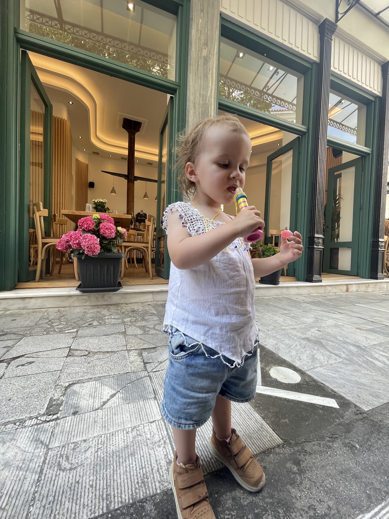Gut gelauntes Kind – > gut gelaunte Eltern. Ab in die City. Athen kommt uns ganz schön teuer. Ich shoppte 3 Kleider (Bangkok-Preise), Chris Schuhe und unsere Tochter hat einfach Freude am Musik machen und entdeckte eine E-Gitarre und eine Rassel für sich. Der Besitzer schenkte ihr noch eine Flöte dazu. Er meinte, das muss man fördern. 30 Grad im Schatten -> puh! Echt schön und echt heiß war unser erster Tag in Athen. Nach unserer Shoppingtour (die so nicht geplant war), zwei Eis und ein paar Fotos waren wir um 17 Uhr am Stellplatz zurück. Duschen, Essen und ab ins Betti.