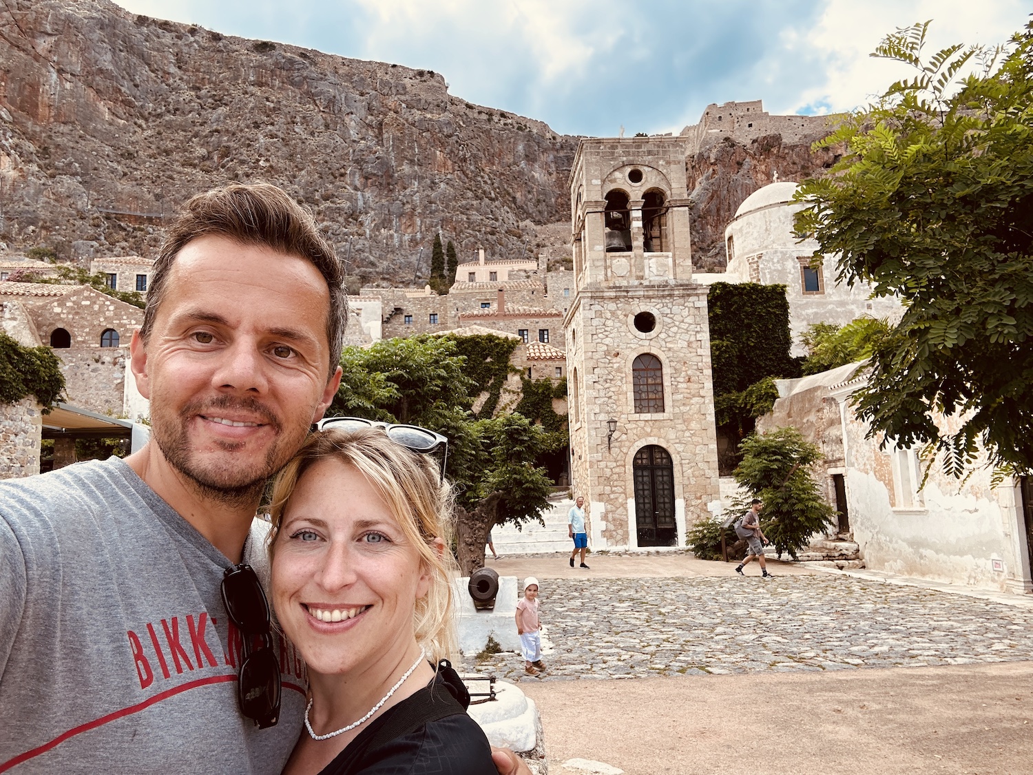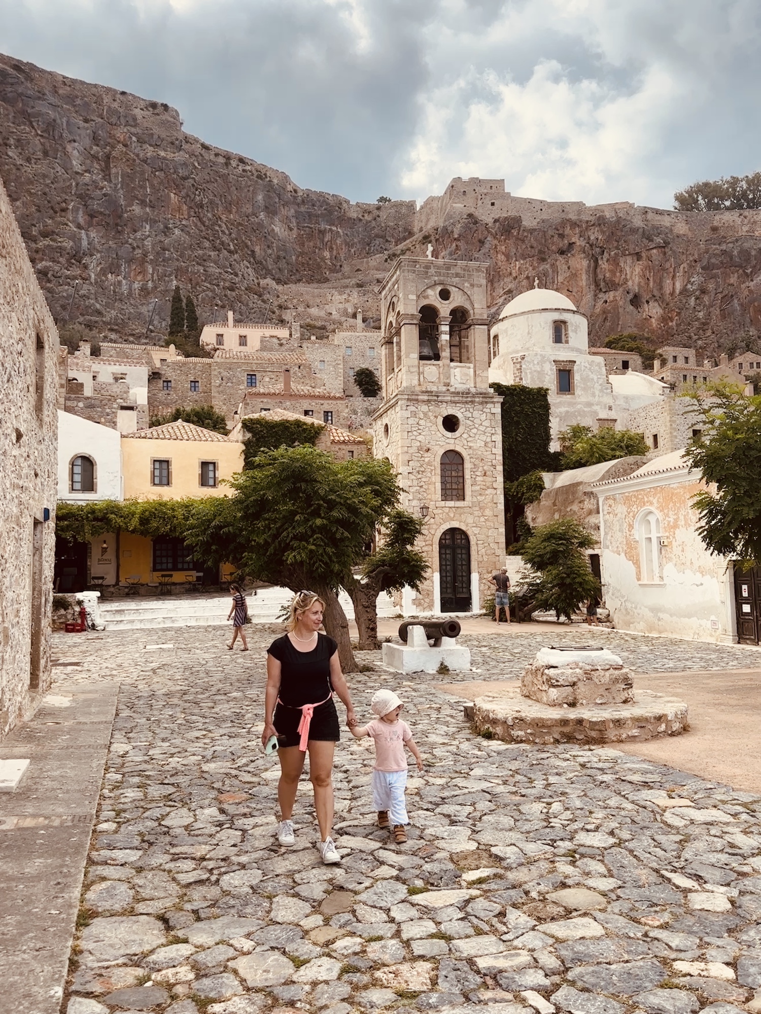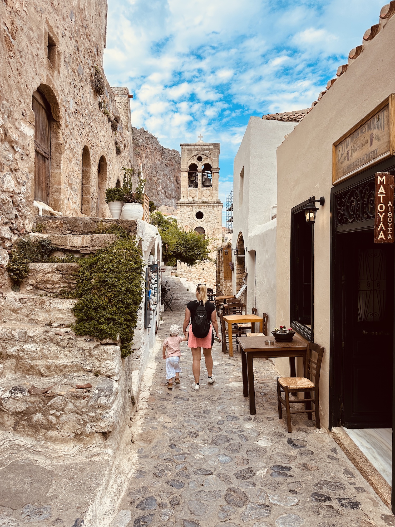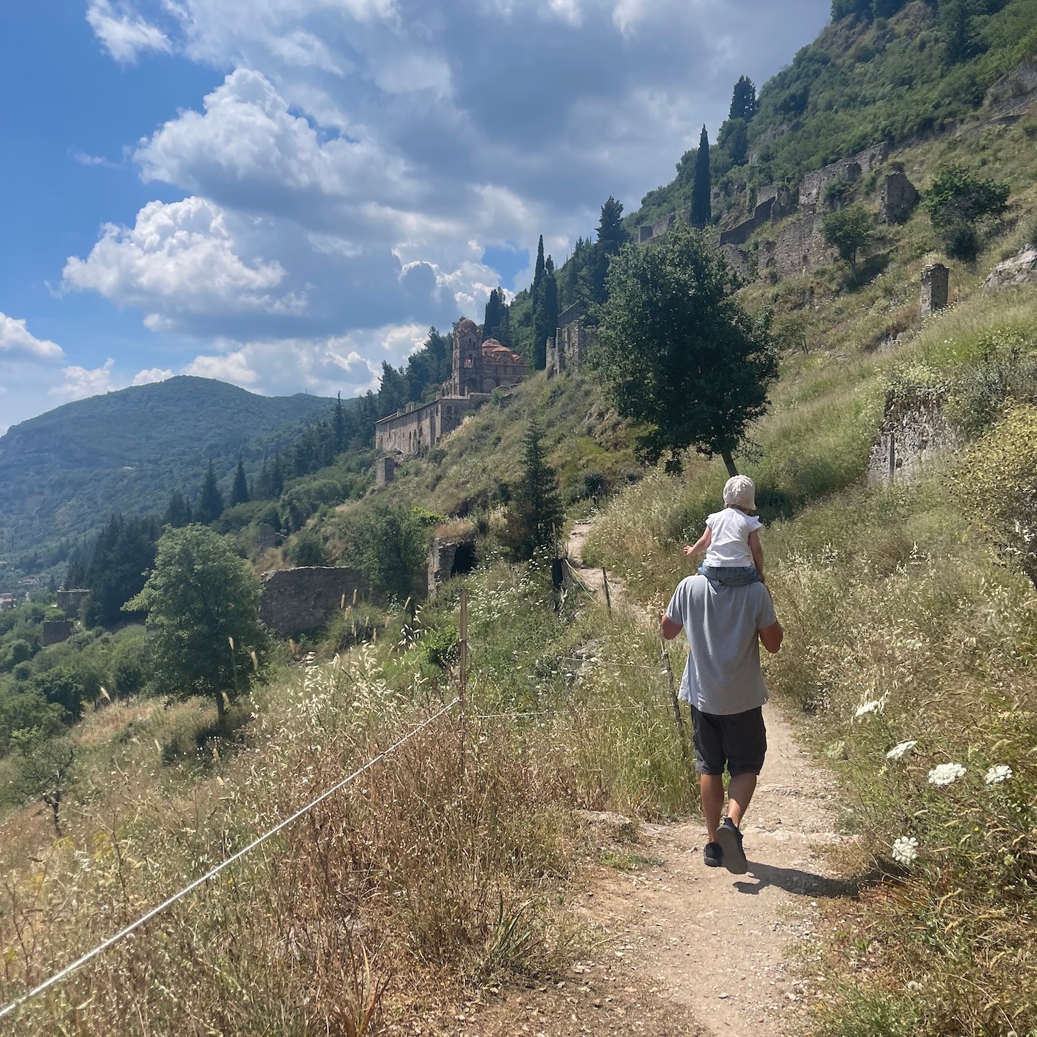 Chris wollte unbedingt eine Radtour machen und wir sind weiter gekommen als gedacht. Auf einem 600 Meter hohen Berg liegt die UNESCO-Weltkulturerbestätte Mystras. Eine byzantinische Ruinenstadt in der Nähe des gleichnamigen Dorfes. Bis zum Eingang der Ruinenstadt konnten wir mit dem Rad fahren, den Rest mussten wir über Steintreppen hochlaufen. Die Straße bis zur Ruinenstadt war wenig befahren und wir konnten schön in die Pedale treten. Chris hatte Fleur noch im Kindersitz, also 12 Kilo mehr Gepäck.