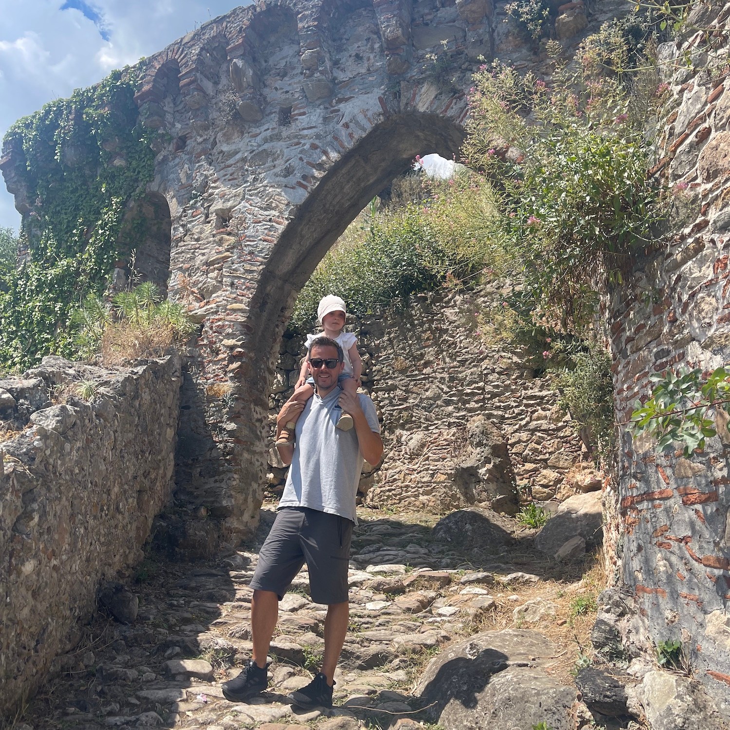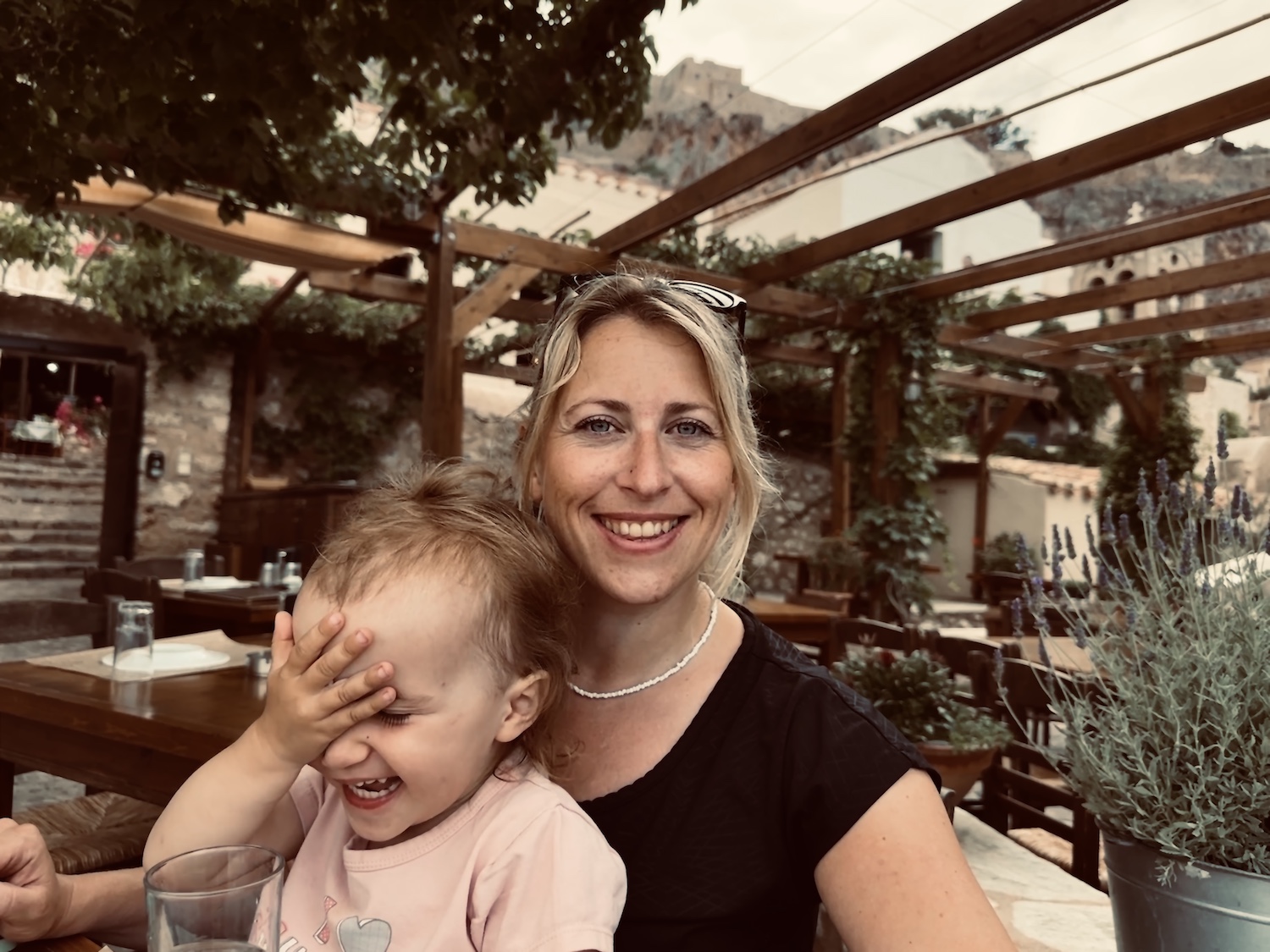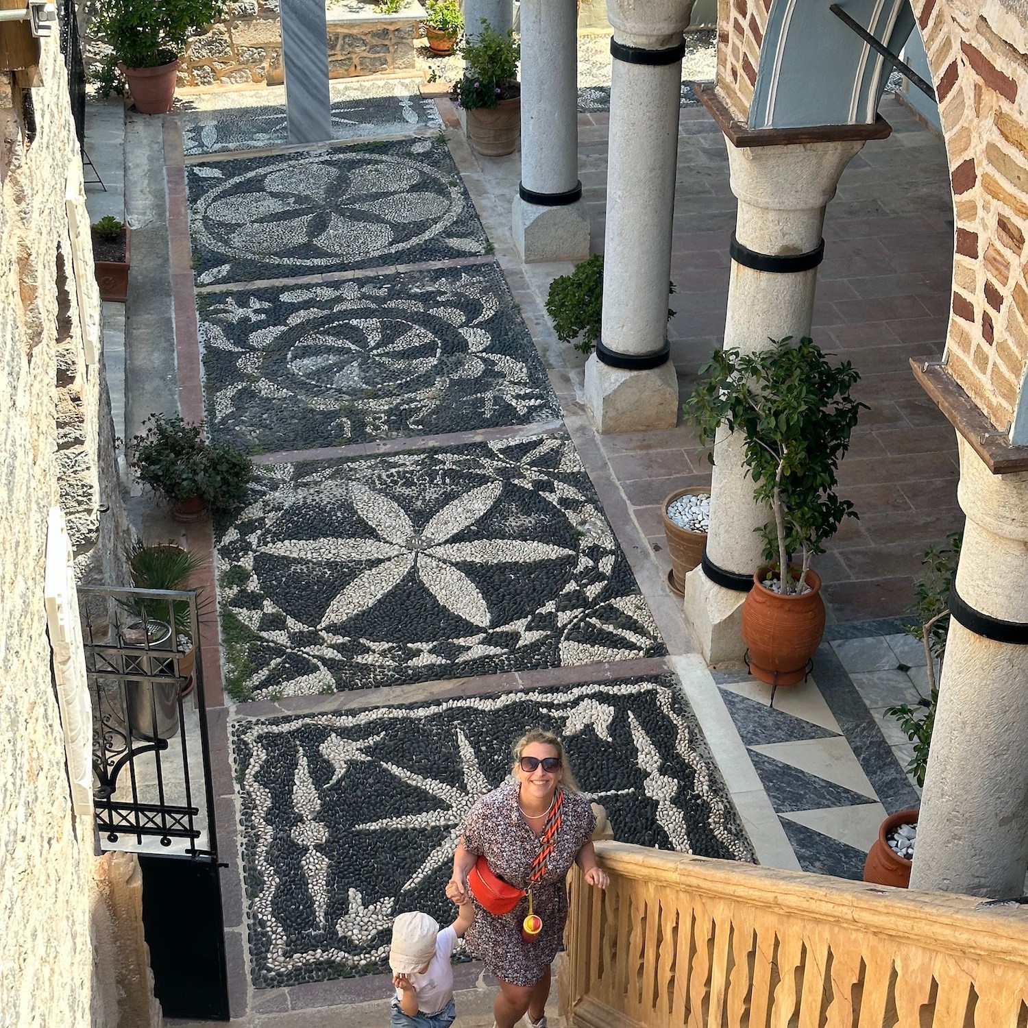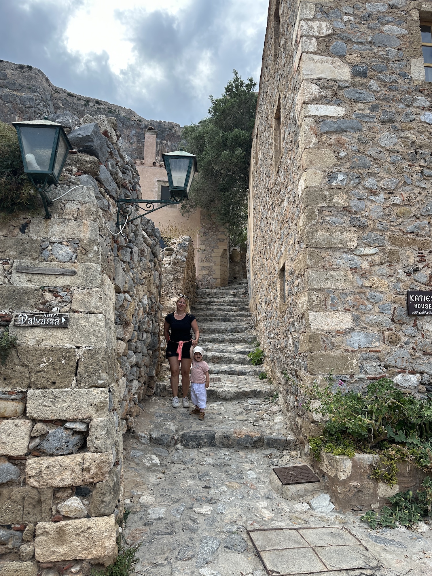 Chris wollte unbedingt eine Radtour machen und wir sind weiter gekommen als gedacht. Auf einem 600 Meter hohen Berg liegt die UNESCO-Weltkulturerbestätte Mystras. Eine byzantinische Ruinenstadt in der Nähe des gleichnamigen Dorfes. Bis zum Eingang der Ruinenstadt konnten wir mit dem Rad fahren, den Rest mussten wir über Steintreppen hochlaufen. Die Straße bis zur Ruinenstadt war wenig befahren und wir konnten schön in die Pedale treten. Chris hatte Fleur noch im Kindersitz, also 12 Kilo mehr Gepäck.