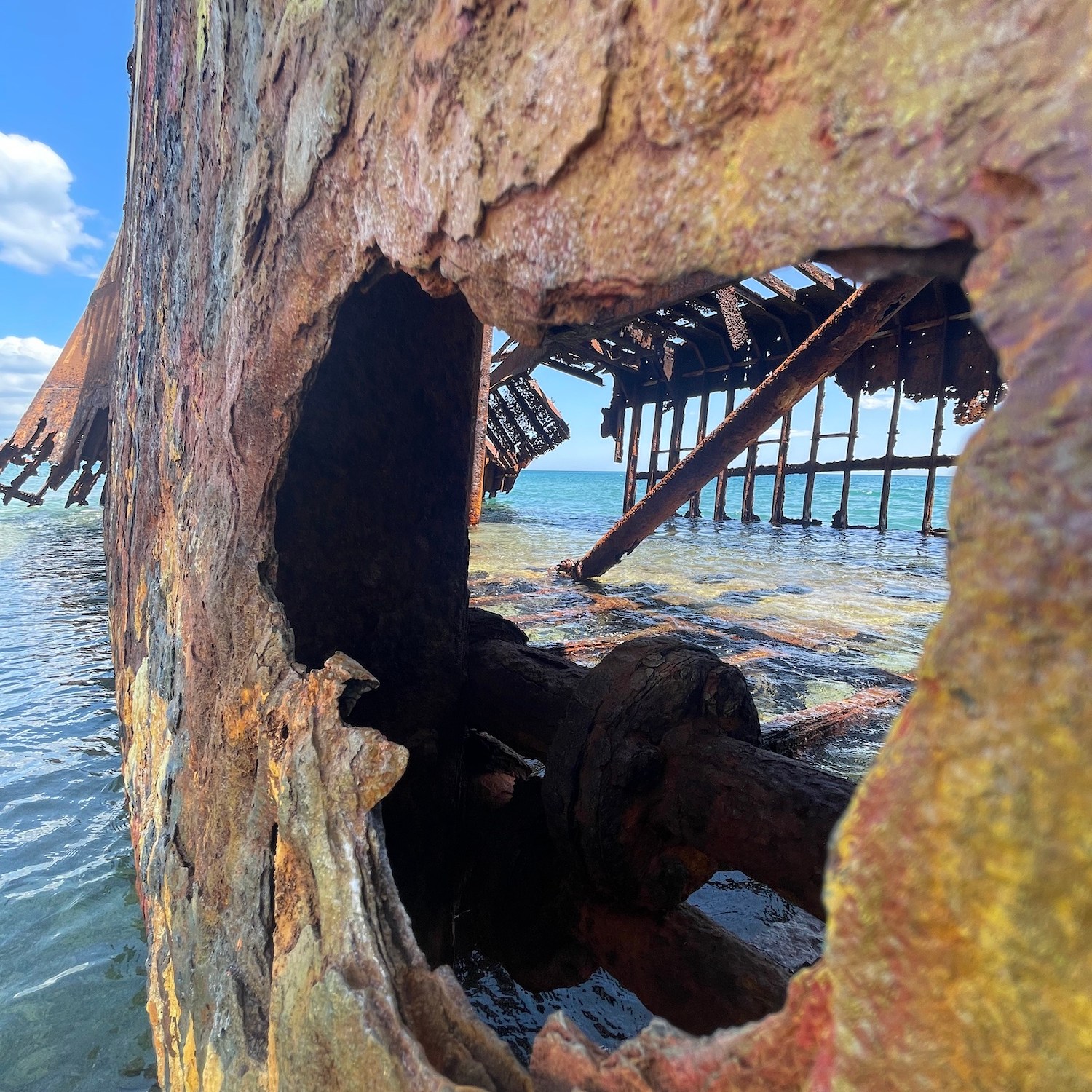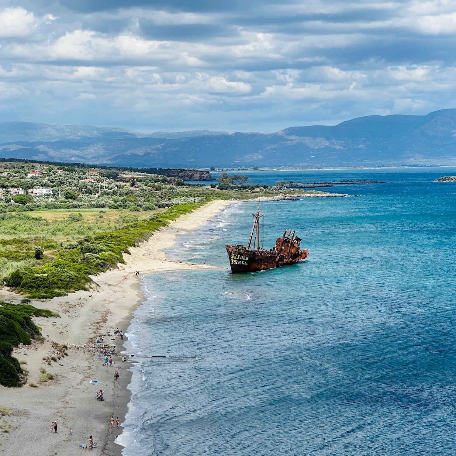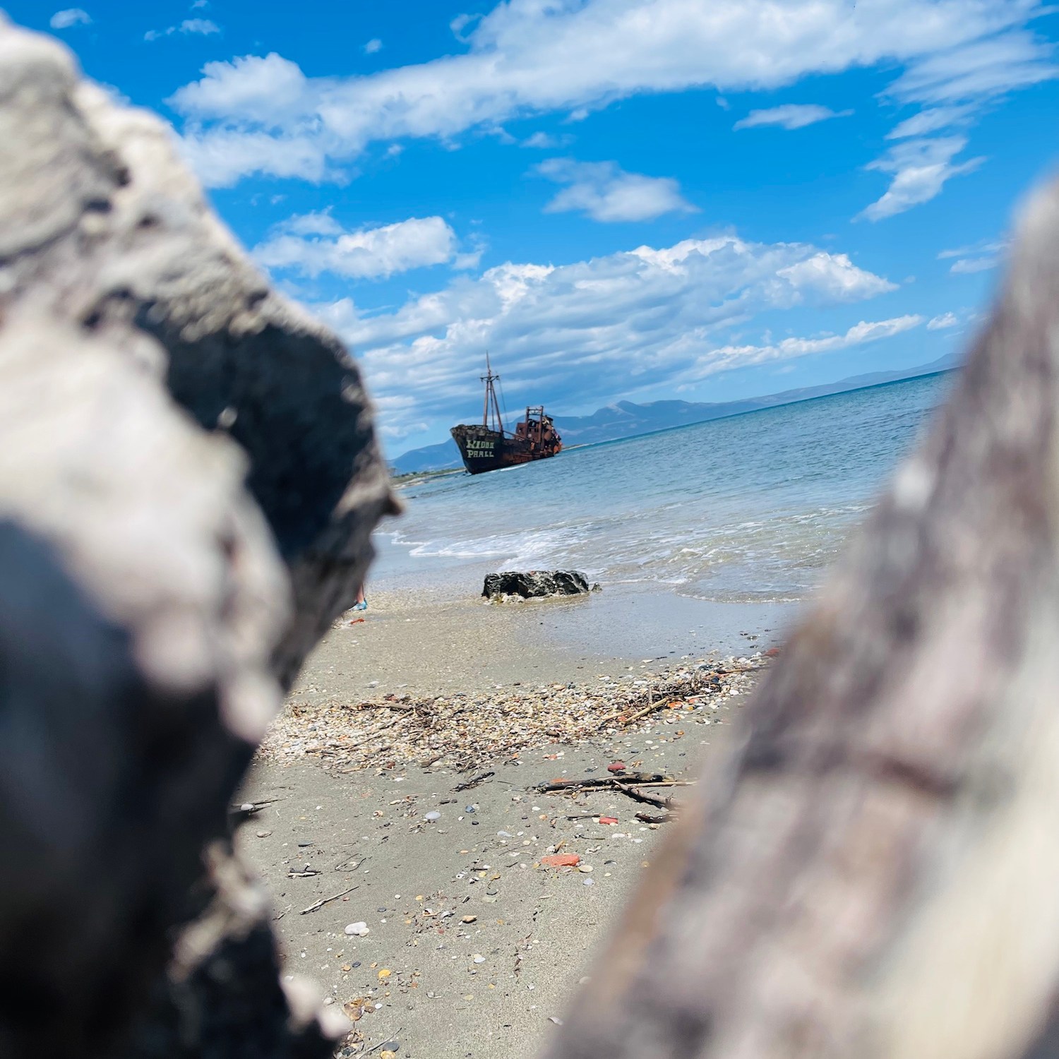 Seit 1981 liegt das Wrack des Geisterschiff „Dimitrios“ in der Sandbucht Valtaki vor der griechischen Stadt Gythio. Bei einem Sturm riss es sich von der Kaimauer der Stadt Gythio los und trieb fast fünf Kilometer bis in die Bucht Valtaki, wo es auf Grund lief und seitdem als Wrack auf Sand liegt. Außerdem munkelt man, dass es ein Schmugglerschiff war. Nicht weit vom Geisterschiff entfernt, fuhren wir 2 Nächte auf einen Campingplatz mit Pool. Perfektes Timing, denn wir hatten viel Wind und ein wenig Regen und der Campingplatz bzw. unser Stellplatz war durch die hohen Bäume super geschützt. Fleur konnte auch im Kinderclub ein bisschen mitmachen. Die Kinderclubs sind meistens erst ab 5 Jahre, aber wenn einer von uns beiden dabei ist, darf sie meistens auch malen und basteln und eben dabei sein.