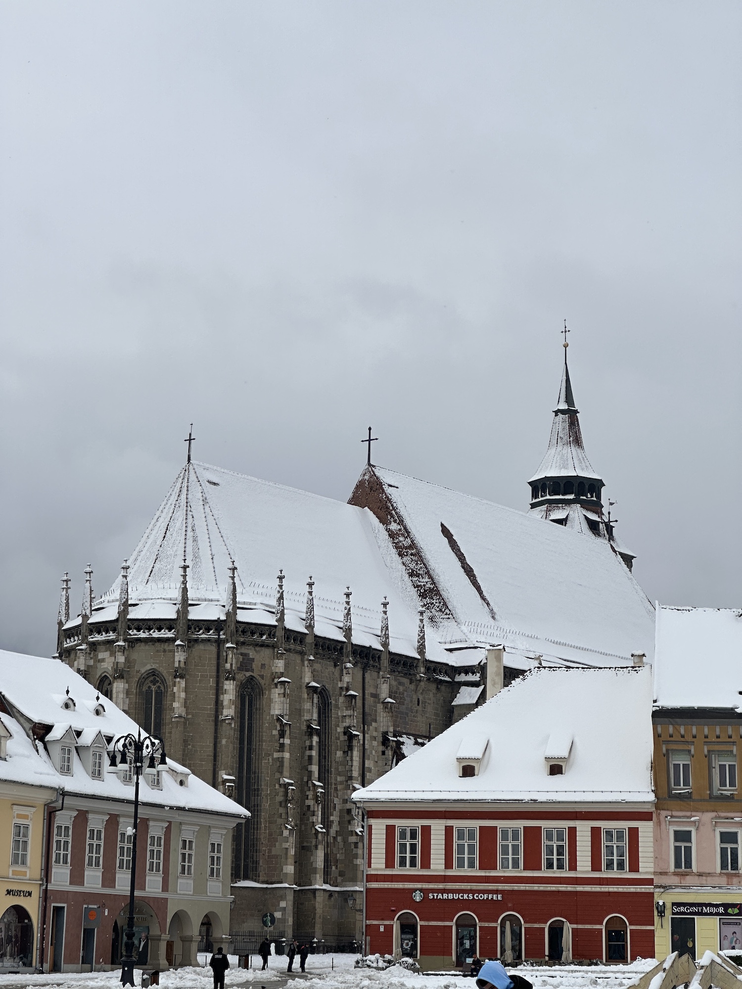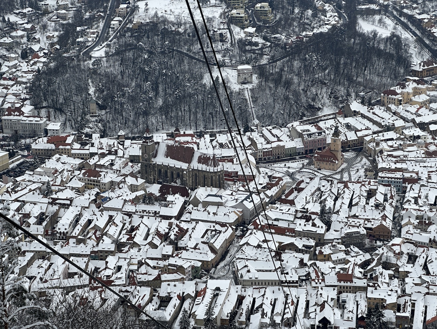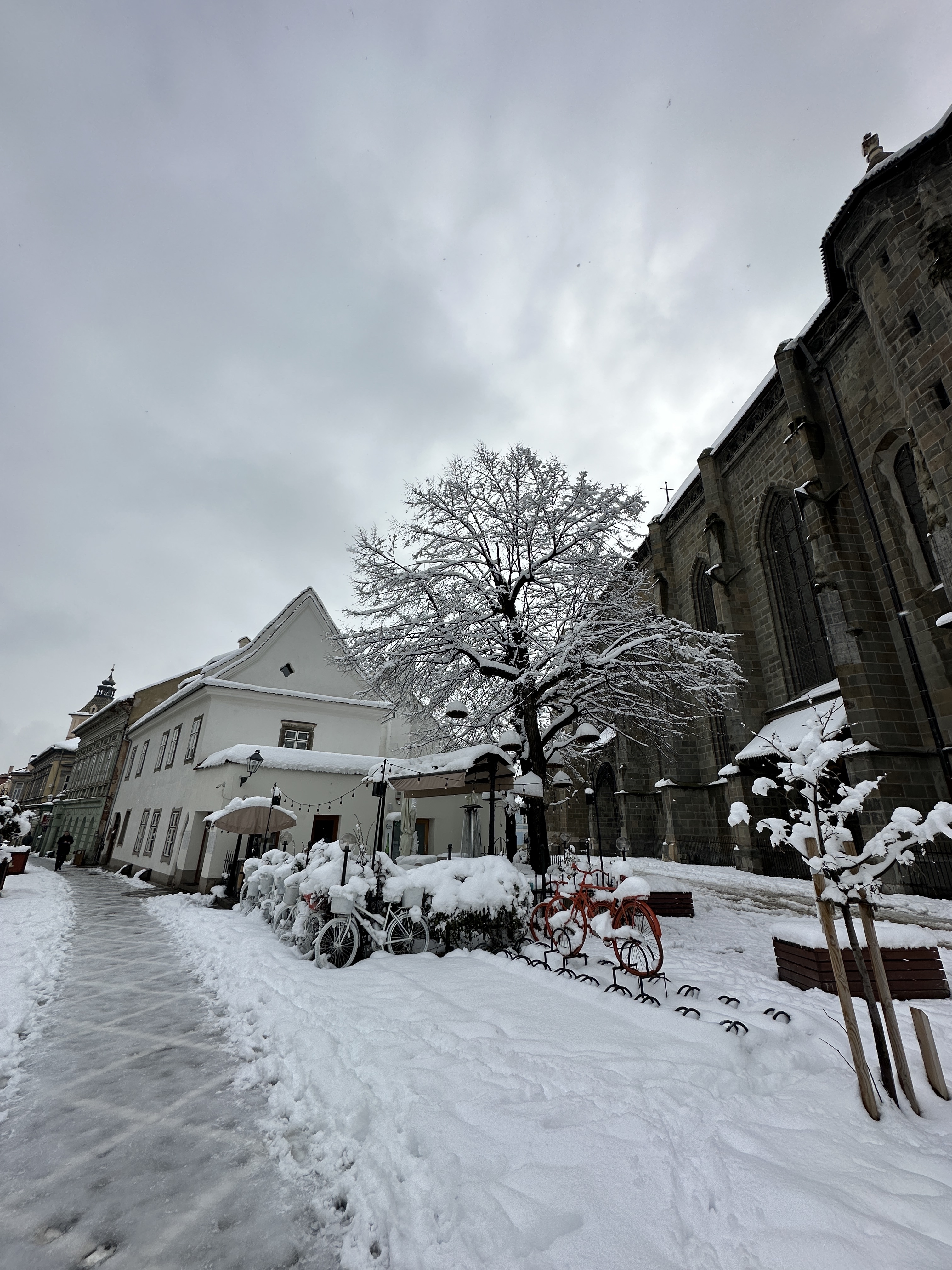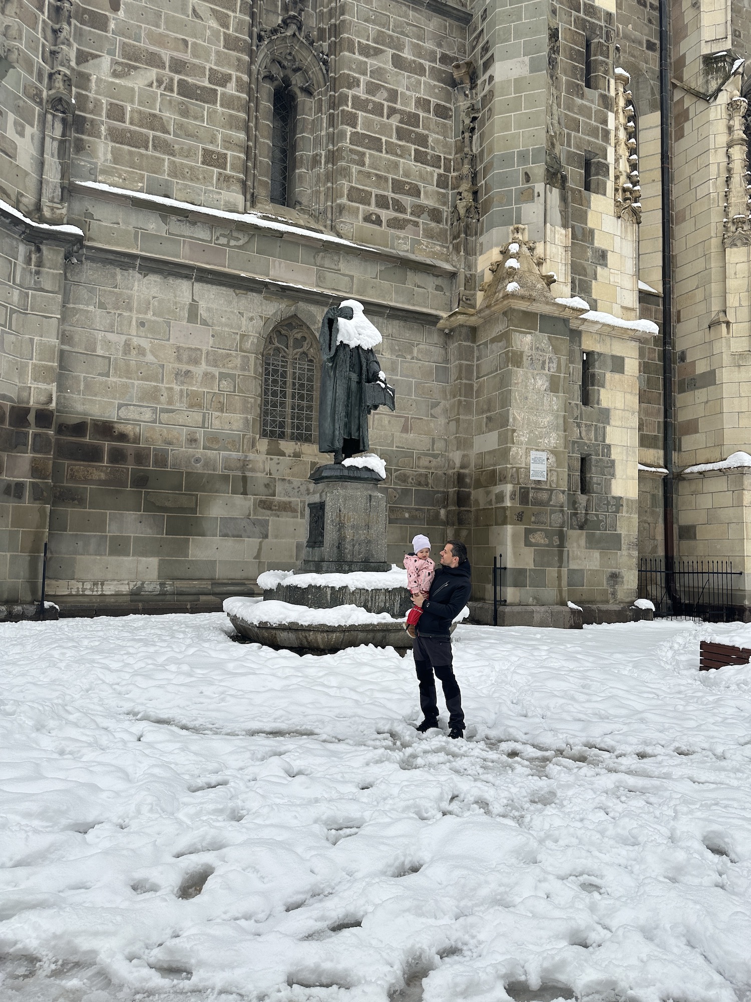 Kein Wetterbericht hat uns „gewarnt“. Kronstadt bei Schnee sieht wunderschön aus. Wir hatten nur zwei Herausforderungen – ein zahnendes Kind ohne Winterkleidung und einen Zoom-Call um 10 Uhr – mit Kind im Bus schlecht. Also musste sofort ein Plan her.