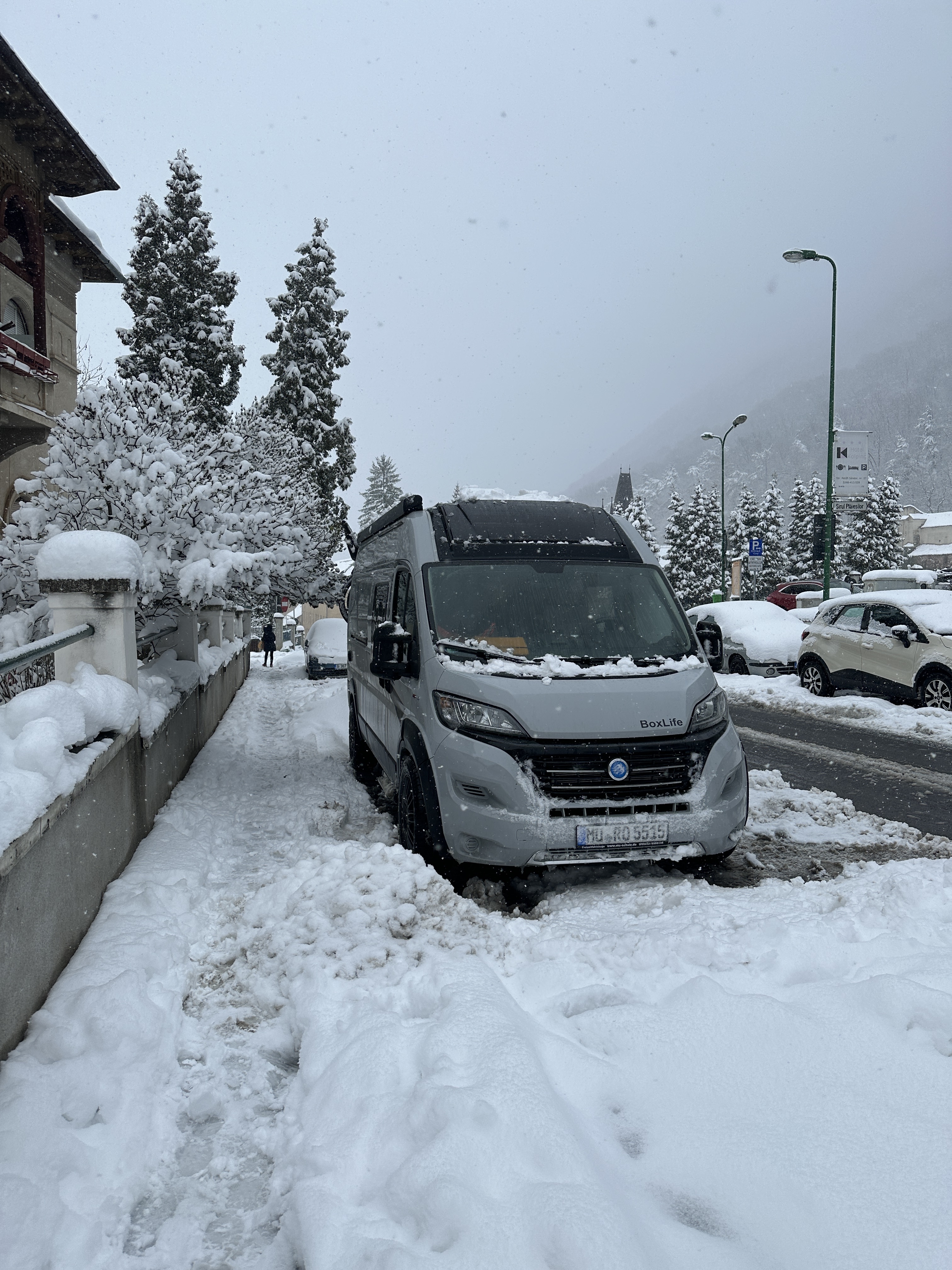 Gegen 18 Uhr fuhren wir wieder zu unserem alten Parkplatz. Da die Nacht direkt an einer Hauptstraße doch recht laut war, wollten wir schauen, ob noch ein anderer Stellplatz zu finden ist – keine gute Idee. Die Nebenstraßen waren nämlich alle nicht geräumt und wir mussten mit unserem Bus über kleine Gassen wieder an die Hauptstraße zurück (alles Einbahnstraße). Unsere neuen Reifen haben uns den A**** gerettet, denn fast wären wir wie ein paar andere in einer sehr engen Kurve in ein Auto gerutscht. In vielen Gasse hingen Autos kreuz und quer und wir wollten nichts mehr riskieren und fuhren zur alten Straße zurück. Wir hatten uns zuvor einen ganz anderen Parkplatz in der App Park4Night markiert, aber die Betreiber haben das System umgestellt. Keine Wohnmobile.