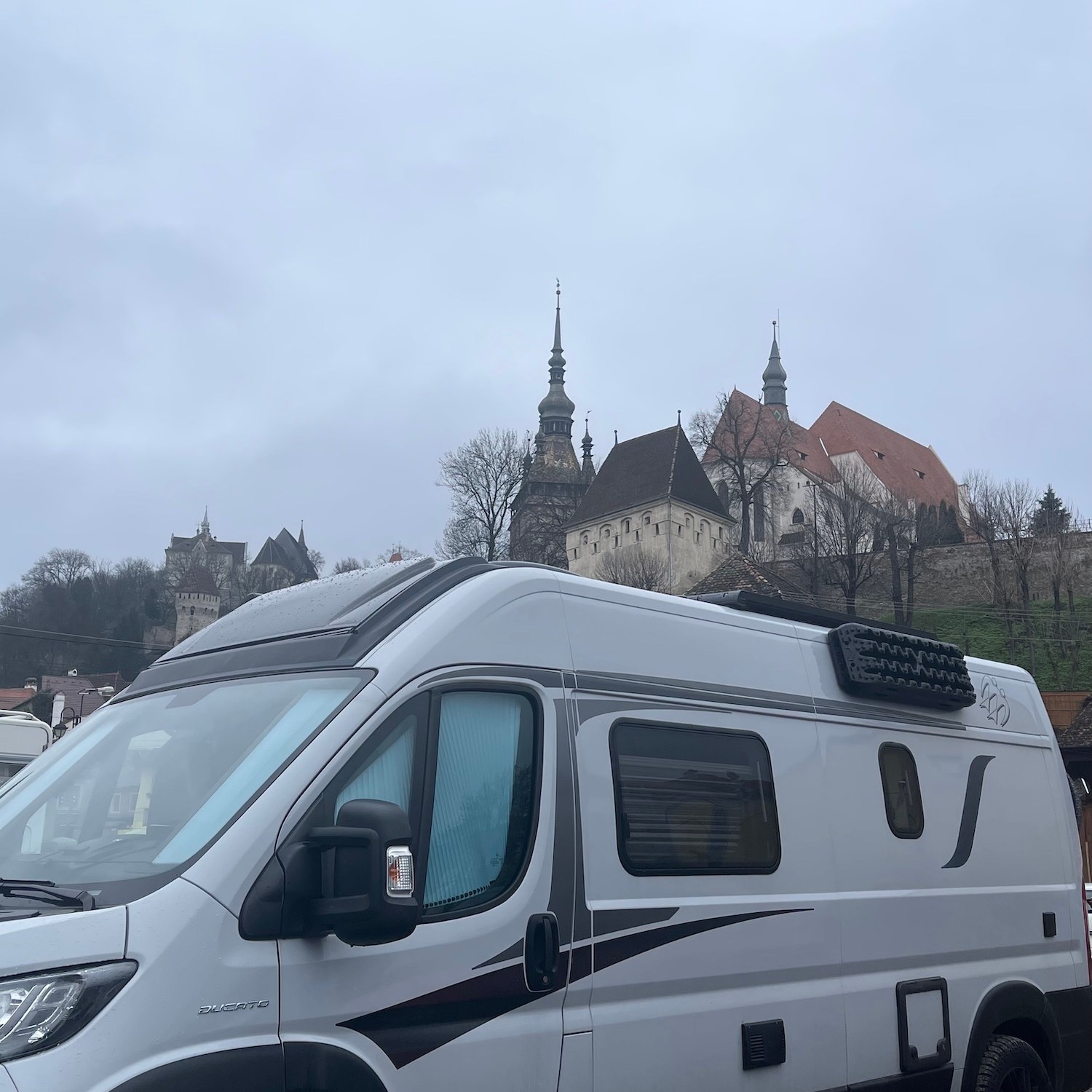 Sighisoara heißt auf Deutsch übrigens Schäßburg und dort kamen wir bei regnerischem Wetter am frühen Abend an. Da wir am nächsten Tag nur schnell die Highlights besichtigen und dann sowieso weiter wollten, parkten wir auf einem großen Parkplatz. Die Nacht war ruhig und der nächste Morgen mal wieder regnerisch. Trotzdem freuten wir uns Schäßburg kennenzulernen und auch unsere Nachbarn. Seit einer Woche haben wir kein Wohnmobil gesehen, irgendwie total verrückt. Ein pensioniertes Ehepaar mit einer kleinen jungen Katze waren die Besitzer des Concorde. Er war Arzt, sie wird bald an der Hüfte operiert und die Katze haben sie in Griechenland vor den Geiern gerettet (wirklich so). Mehr ersparen wir euch – sehr nett auf jeden Fall.