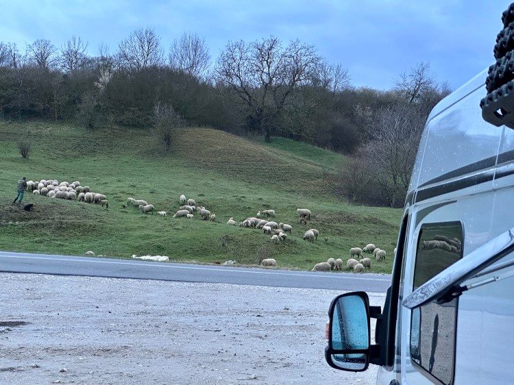 Unser nächster Stellplatz ist eine Parkbucht bei Turda, umgeben von Feldern und Schafen.