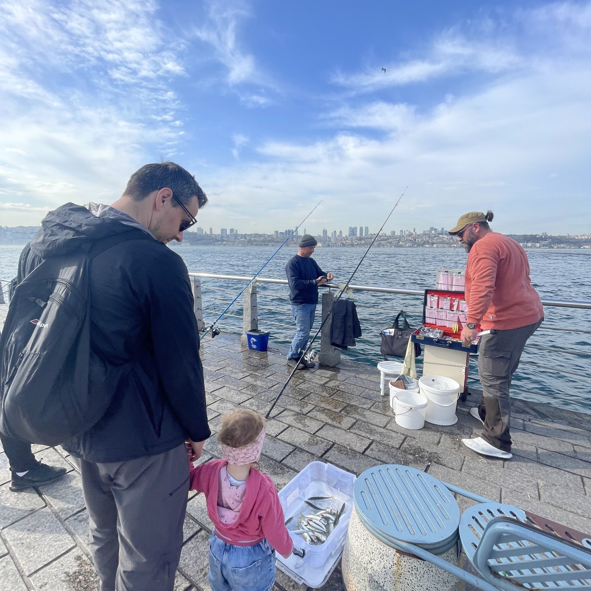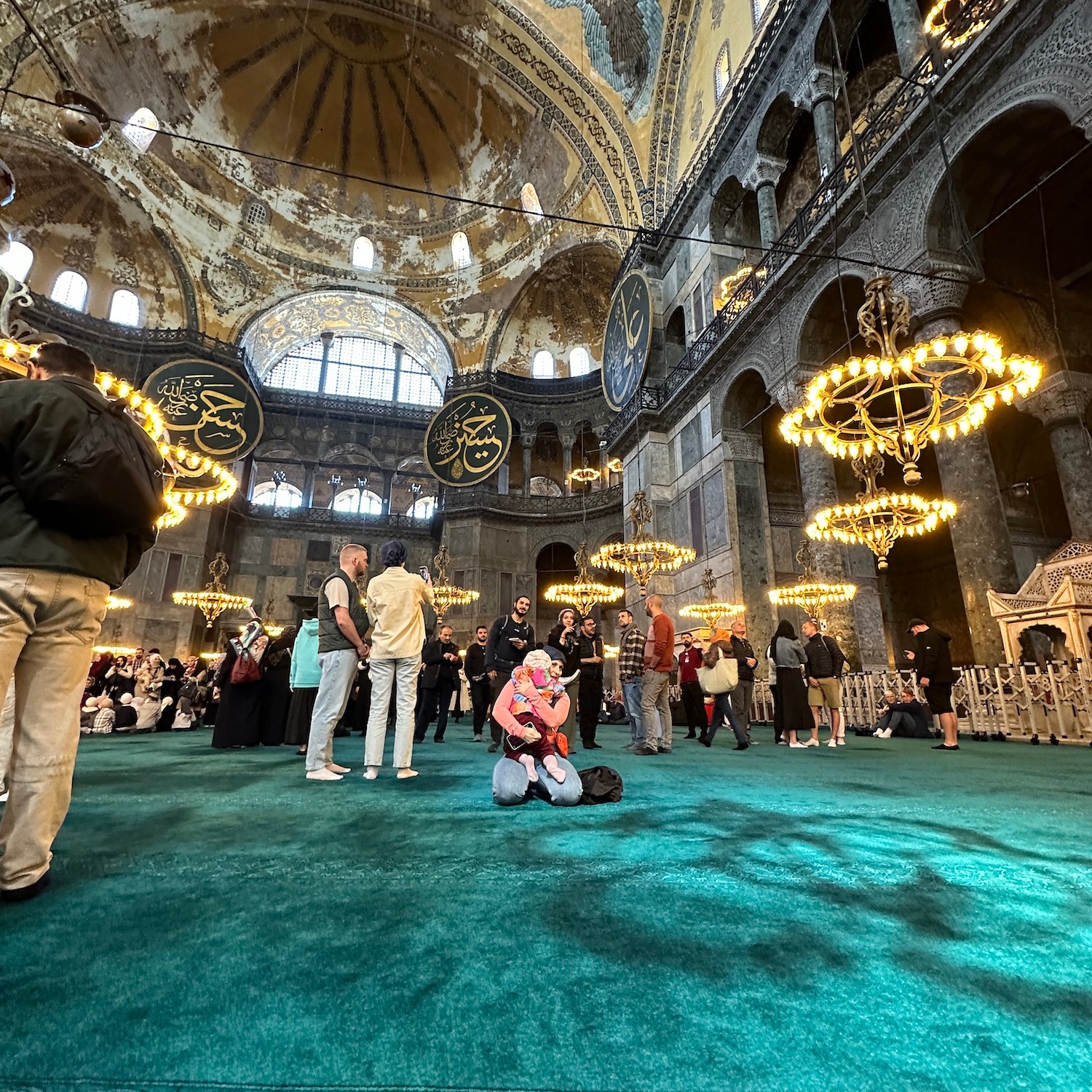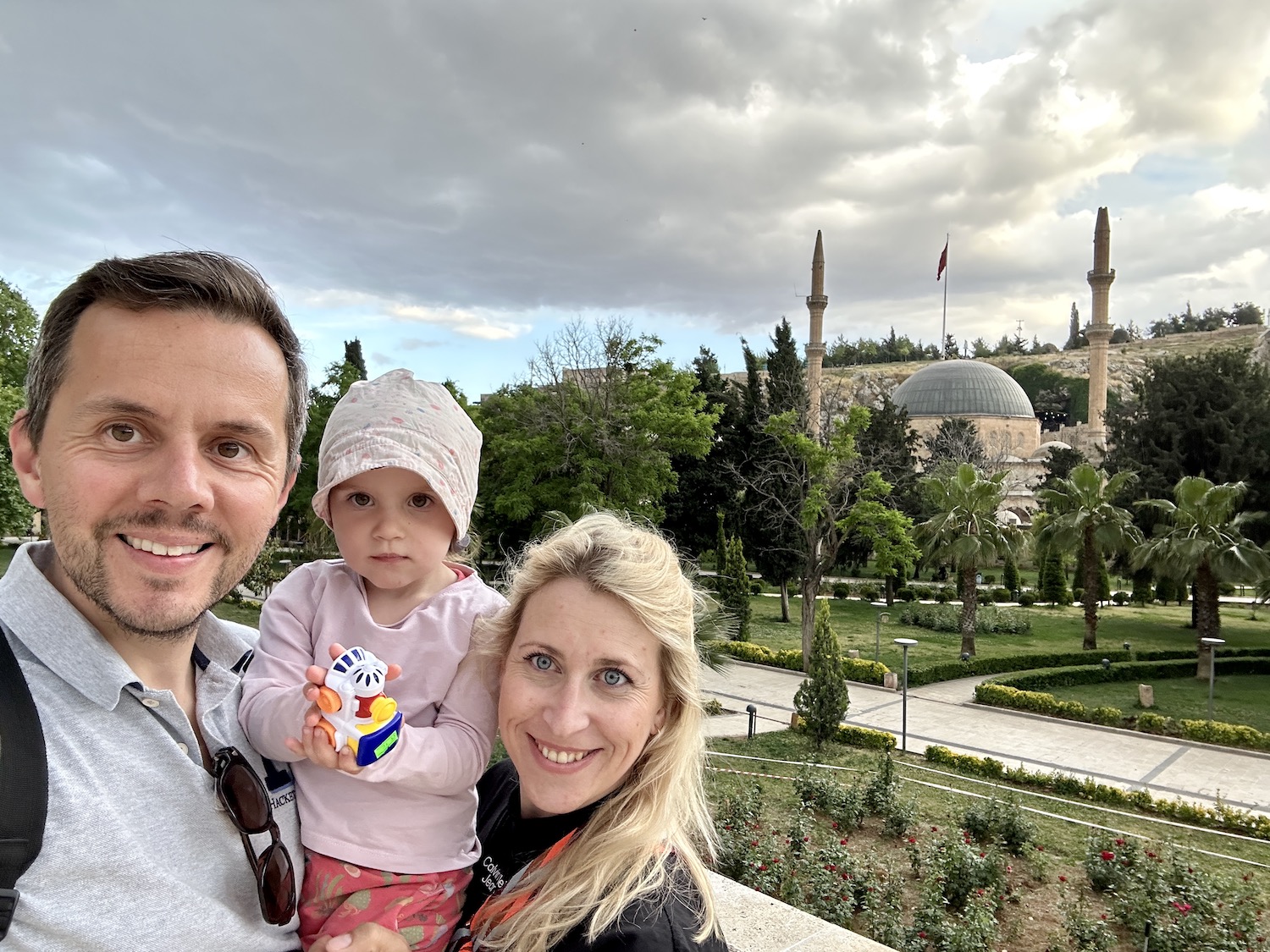 Es war sehr viel Verkehr. Ein kleiner Stellplatz zwischen Marmarameer und Stadt erwartete uns. Da es schon später Nachmittag war, wollten wir nur eine kleine Runde spazieren gehen und uns die Umgebung ansehen. Sofort erinnerte uns Istanbul ein wenig an Bangkok – nur die Stromleitungen fehlten. Nach kurzer Zeit regnete es mal wieder und wir suchten uns ein Café. Im Baklava Himmel angekommen warteten wir den Regen ab und merkten, sofort wie herzlich die Menschen hier sind. Die darauffolgende Tagen hatten wir bestes Wetter. 18-20 Grad und Sonnenschein. Eigentlich wollten wir nur 4 Tage in Istanbul bleiben, verlängerten dann doch auf 6 Tage. Wir wussten ja schon, dass Türken Gastfreundschaft leben, aber so wie wir es in Istanbul erlebt haben, hätten wir es uns nicht erträumen können. Wir waren 5 Tage, jeden Tag zwischen 8 km und 13 km zu Fuß und ohne Kinderwagen unterwegs. Nutzten Bus, Bahn, Metro, Boot und Taxi und haben fast jeden Stadtteil besichtigt. Egal wo uns wurde immer ein Sitzplatz angeboten. An jeder Ecke (es waren wirklich viele :)) bekam Fleur etwas in die Hand gedrückt. Obst, Süßigkeiten, eine Blume……am Anfang war es ein wenig befremdlich, weil wir sofort dachten, wir müssen etwas kaufen – aber nein – es war einfach eine Aufmerksamkeit für unsere Tochter. Wir trafen auf eine kleinere Moschee und da keine Touristen um uns herum waren, dachten wir – die schauen wir uns mal in Ruhe an. Es gab einen abgetrennten Bereich für Männer und Fleur lief mir auf dem Teppich einfach in diesen abgetrennten Bereich hinein und davon. Ich entschuldigte mich bei der Security-Dame sofort und sagte ihr, sie solle sie mir bringen. Sie meinte, „nein nein Kinder sind ok, nur Frauen dürfen nicht rein“. Sie war ganz interessiert an uns, wo wir herkommen, was wir beruflich machen, wie alt wir sind usw.. Da sie nicht so gut Englisch gesprochen hat, rief sie eine Kollegin und bat zu übersetzen. Sie sagte, sie kommt gleich wieder und wir sollen auf sie bitten warten. Nach kurzer Zeit kam sie zurück und sagte – sie wünscht uns alles Liebe und gab uns drei Gebetsarmbänder – als Geschenk.