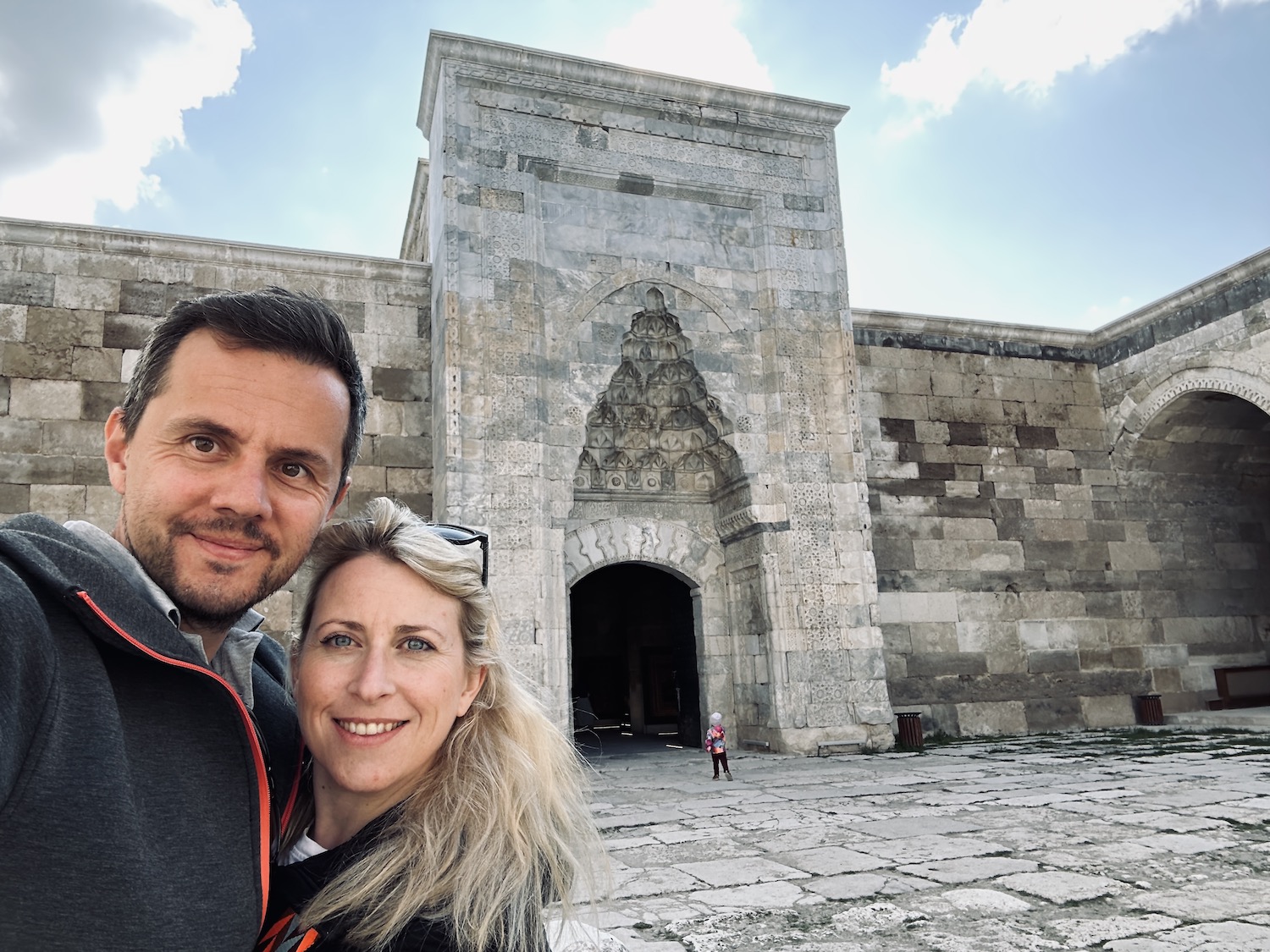 Der Bus mit Wasser aufgefüllt, die Wäsche gewaschen, das Klo entleert und ein ausgeschlafen Kind – > bevor sich die Laune ändert (wir bekommen bald ein Schleudertrauma von ihren Launen) schnell weiter nach Sultanhani. Aufgepasst, jetzt wird’s geschichtlich! In Sultanhani haben wir uns eine der größten Karawansereien angesehen. Sie war eine der größten, weil sie direkt auf der historischen Seidenstraße lag. Gegründet im Jahr 1229 unter Herrscher Kai Kobold 1. Für die Herberge, die Mensch und Tier mit dem nötigsten versorgten, musste die Kaufleute Steuern bezahlen – aber sie waren dort sicher.