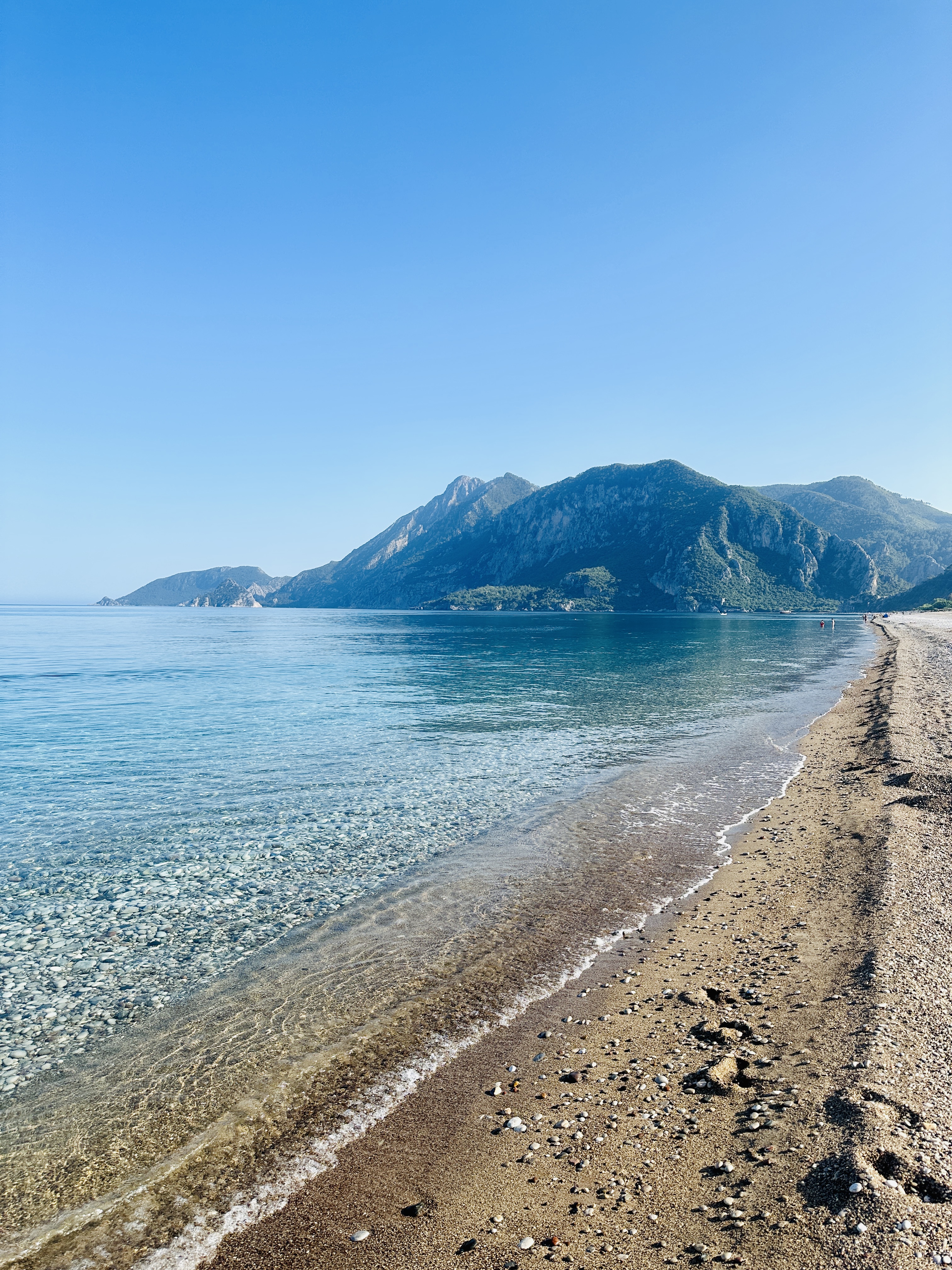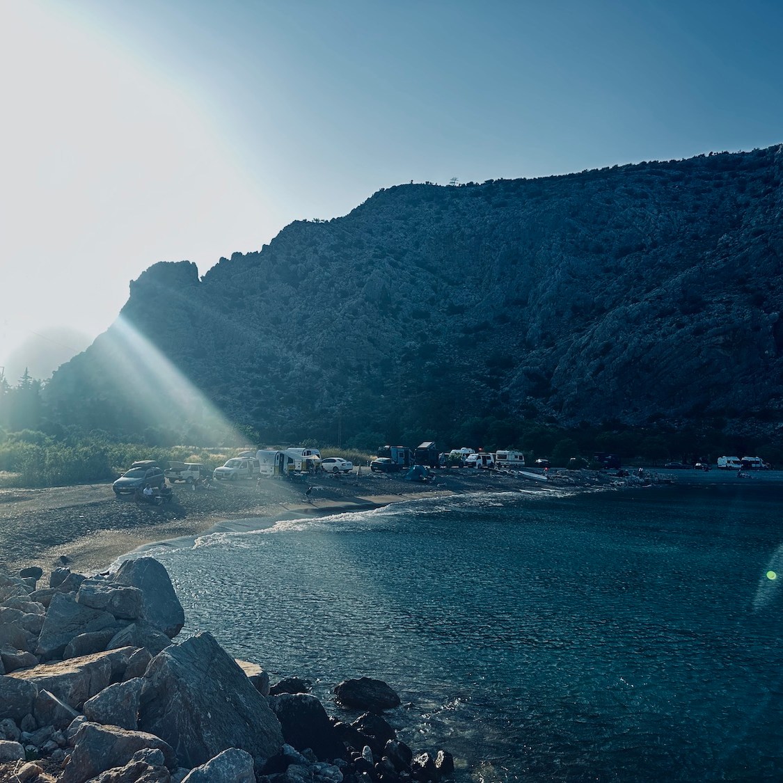 Die Küstenstraße entlang rollten die Räder des Vans dahin. Eigentlich wollten wir in Cirali nur etwas ganz besonders erkunden (dazu später mehr), doch unser Kühlschrank war leer, Fleur hatte Hunger, es war Mittag und hatte 30 Grad. Daher fuhren wir direkt nach Cirali, kauften am Markt ein und sind danach an einen kleinen Campingplatz gefahren. Es war so ein heimeliger Platz, dass wir gleich zwei Nächte dort gebucht haben. Der Strand von Cirali zählt zu den 10 schönsten Stränden der Türkei (wussten wir nicht). Es ist ein Sandstrand mit vielen größeren Steinen. Das Meer glasklar. Links und rechts befinden sich Berge – alles Naturschutzgebiet. Die Bucht sieht super schön aus. Es war herrlich. Unser eigentliches Vorhaben musste also zwei Tage warten – wir chillten erst mal am Strand. Cirali hat sich dem Ökotourismus verschrieben. Man findet dort keine Hotelbunker – also auch keinen Massentourismus.