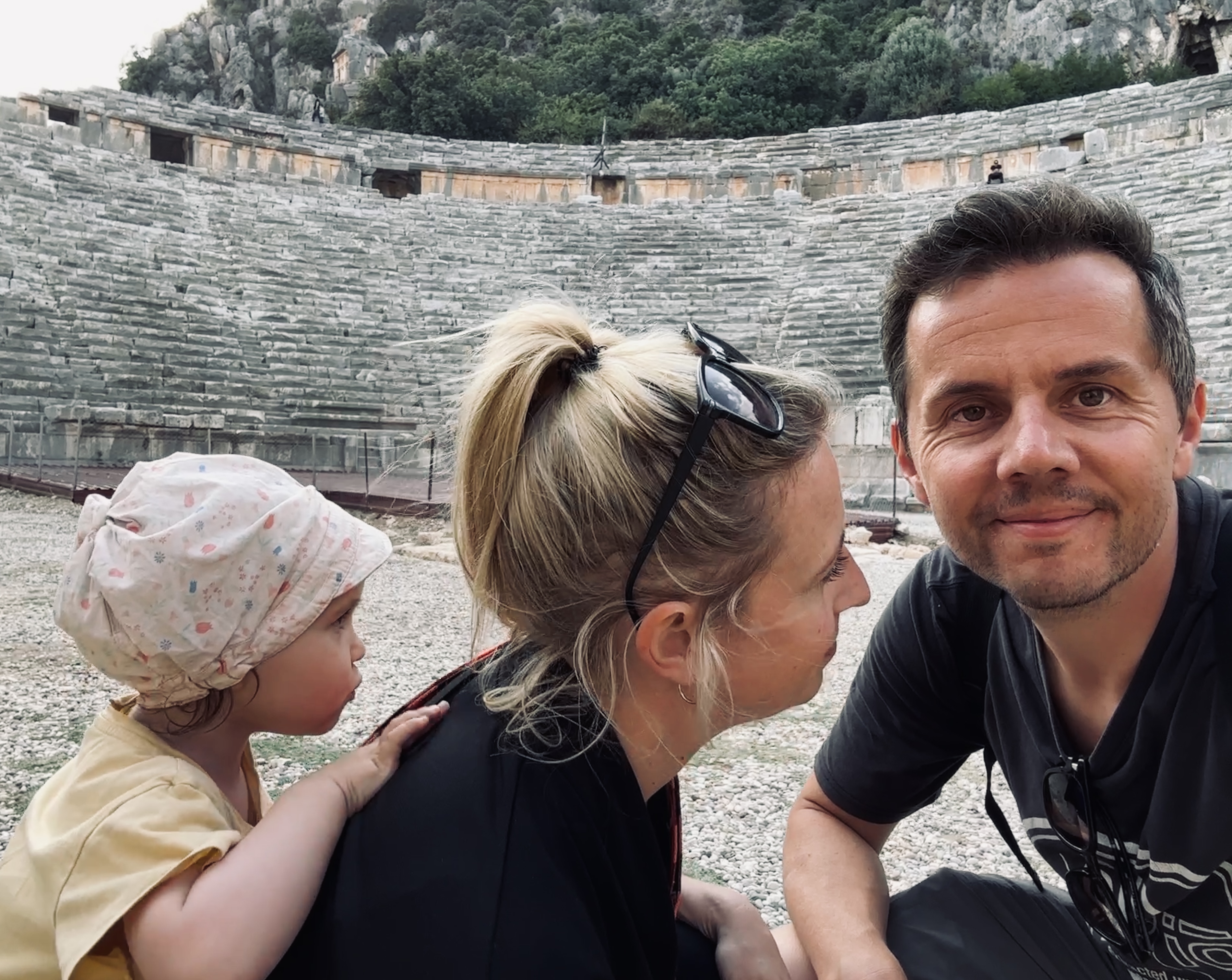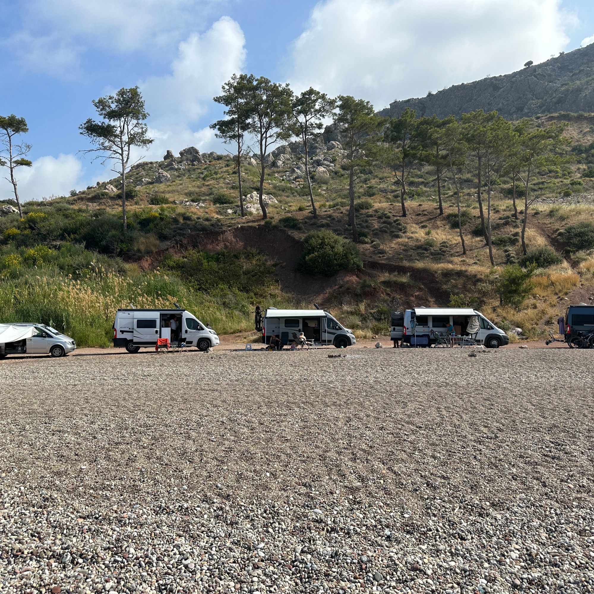 Wir suchten uns einen der ersten sehr gut bewerteten Strand-Stellplätze aus. Ein schöner Platz in einer Bucht. Das ist bisher unsere längste Autofahrt gewesen – die Küstenstrasse hatte es in sich. 5 Stunden. Wir machten 3 längere Pausen und Fleur hat es super mitgemacht. Sie schläft nicht mehr während der Fahrt. Wir übertreiben es mit dem fahren von daher nicht und fahren eigentlich nie recht lange. Auf dieser Strecke haben wir uns echt gewünscht, dass es gut klappt, denn bis nach Side gab es für uns nichts Interessantes zu sehen. Außer Gewächshäuser. Wir konnten Peperoni, Bananen und Erdbeeren erkennen. Manchmal Olivenbäumen sehen. In Side hatten wir einen schönen ruhigen Stellplatz mit ein paar Stufen runter zum Strand. Aber es hat uns dort nicht sooo gut gefallen um noch eine weitere Nacht zu bleiben. Weiter gehts nach Antalya zum Spielplatz, zum berühmten Wasserfall und zum traditionellen (haha) Burger und Pizza essen – Fleur hat richtig reingehauen. Der Parkplatz und die Nacht in Antalya war richtig schlecht… über uns die Flugzeuge (wussten wir), schreiende und streitende Männer und dauerhaftes Hundegebell. Was witzig war, die Hunde heulten mit dem Muezzin und beteten brav mit. Schnell weiter, wohin bleibt noch offen.