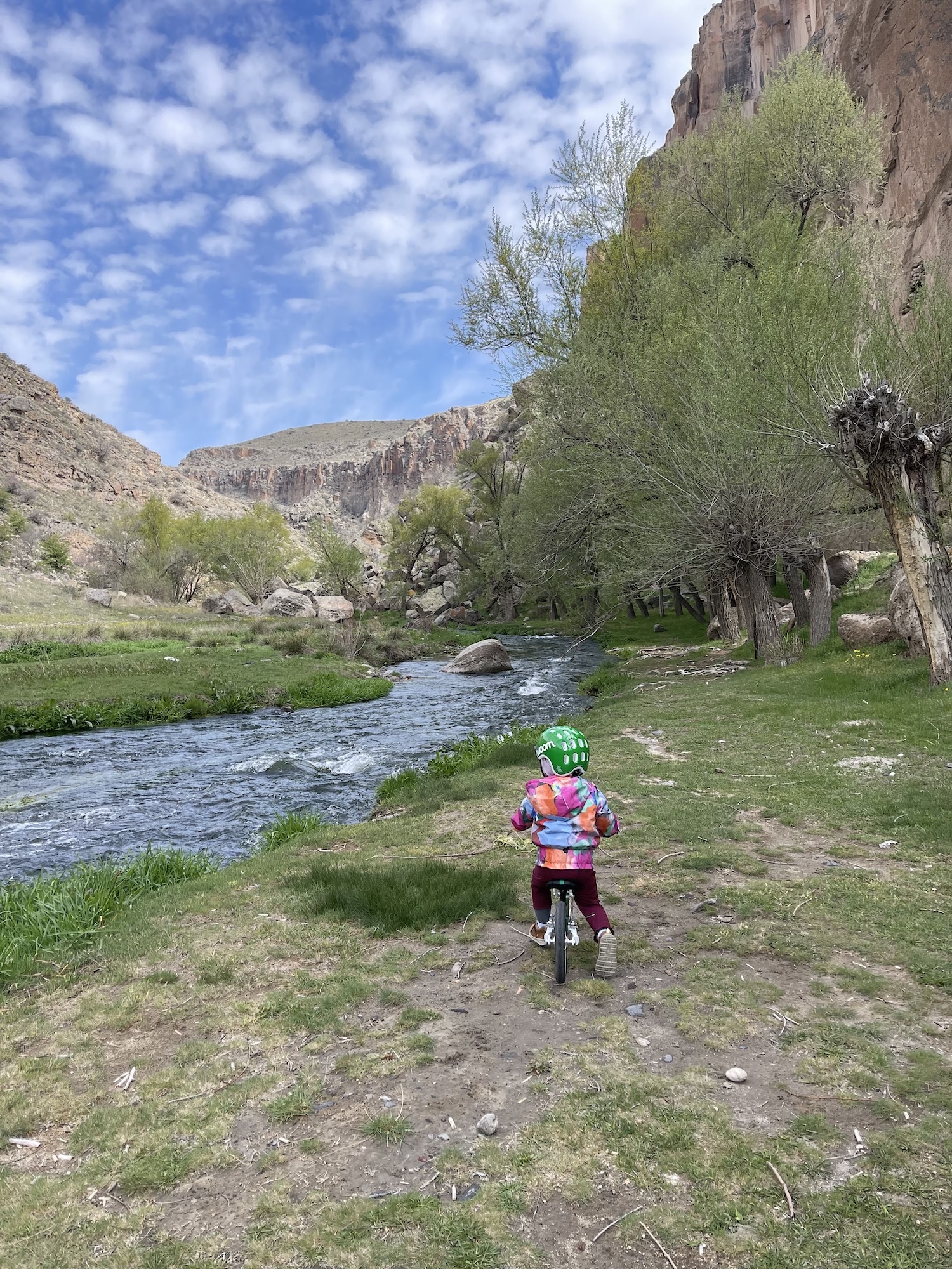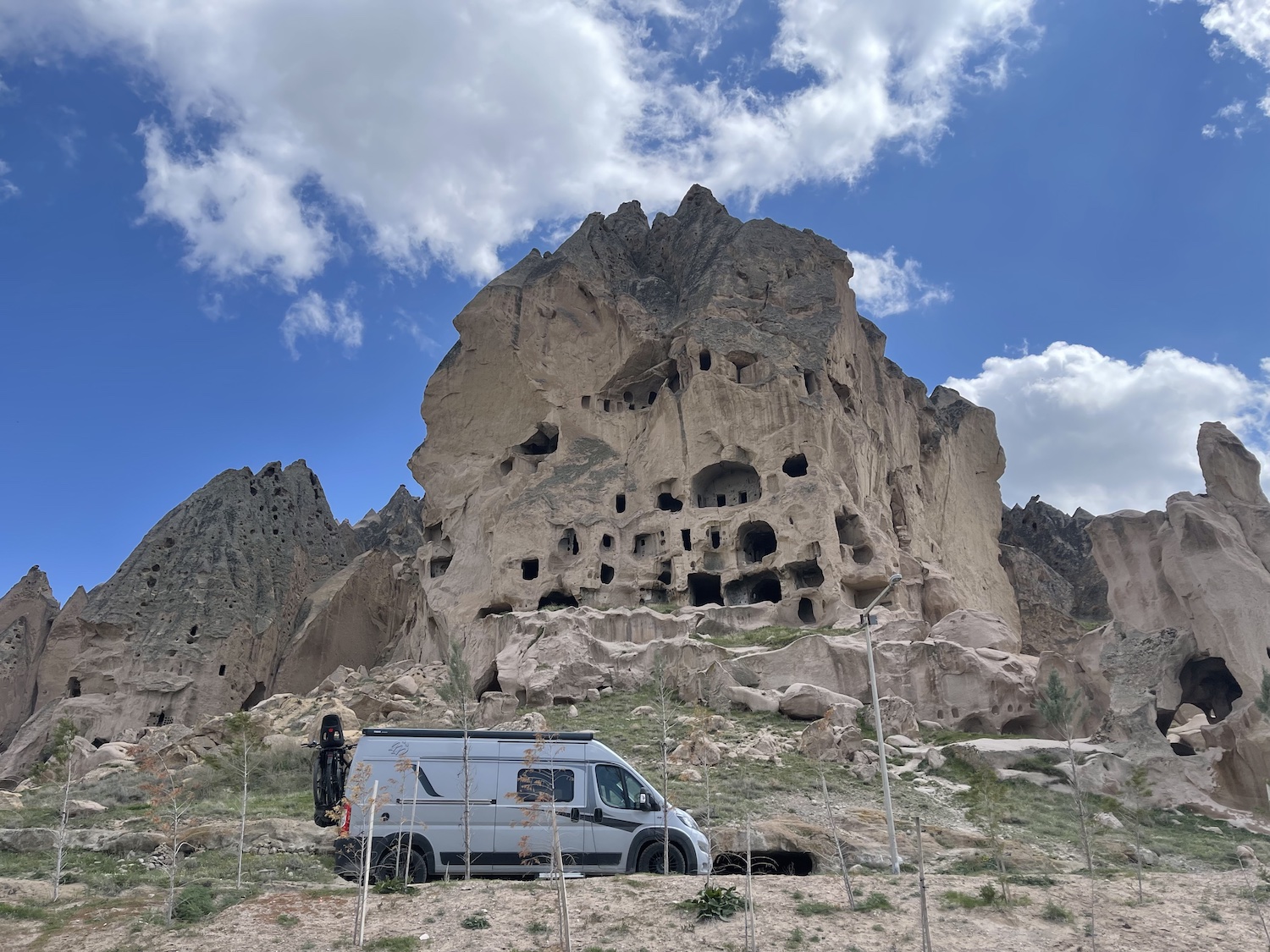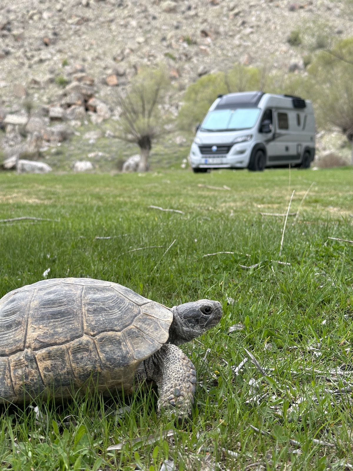 Das Ihlara Tal – eine ca. 15 km lange und bis zu 150 m tiefe Schlucht im Südwesten der Türkei. Hier gibt es etwa 50 Felsenkirchen und jede Menge weitere Höhlenbauten. Unser Stellplatz unten im Tal war einfach unglaublich schön. Es geht sehr sehr steil Bergab/Bergauf und viele Camper fahren dort nicht hinunter. Ein türkischen Paar (sie haben diesen Platz vor 2 Jahren entdeckt und auf Park4Night markiert) und wir standen in UNSEREM Tal zwischen Felswand und kleinem Fluss. Wir wanderten am Fluss entlang und den steilen Berg zu einer Felsenkirche hinauf. Tranken einen türkischen Café in einem der Fluss-Restaurants und verbrachten zwei ruhige Tage. Immer dabei, Fleurs geliebtes Laufrad und ihr Helm. Drei Schildkröten in freier Natur haben wir entdeckt – eine schöne Begegnung.