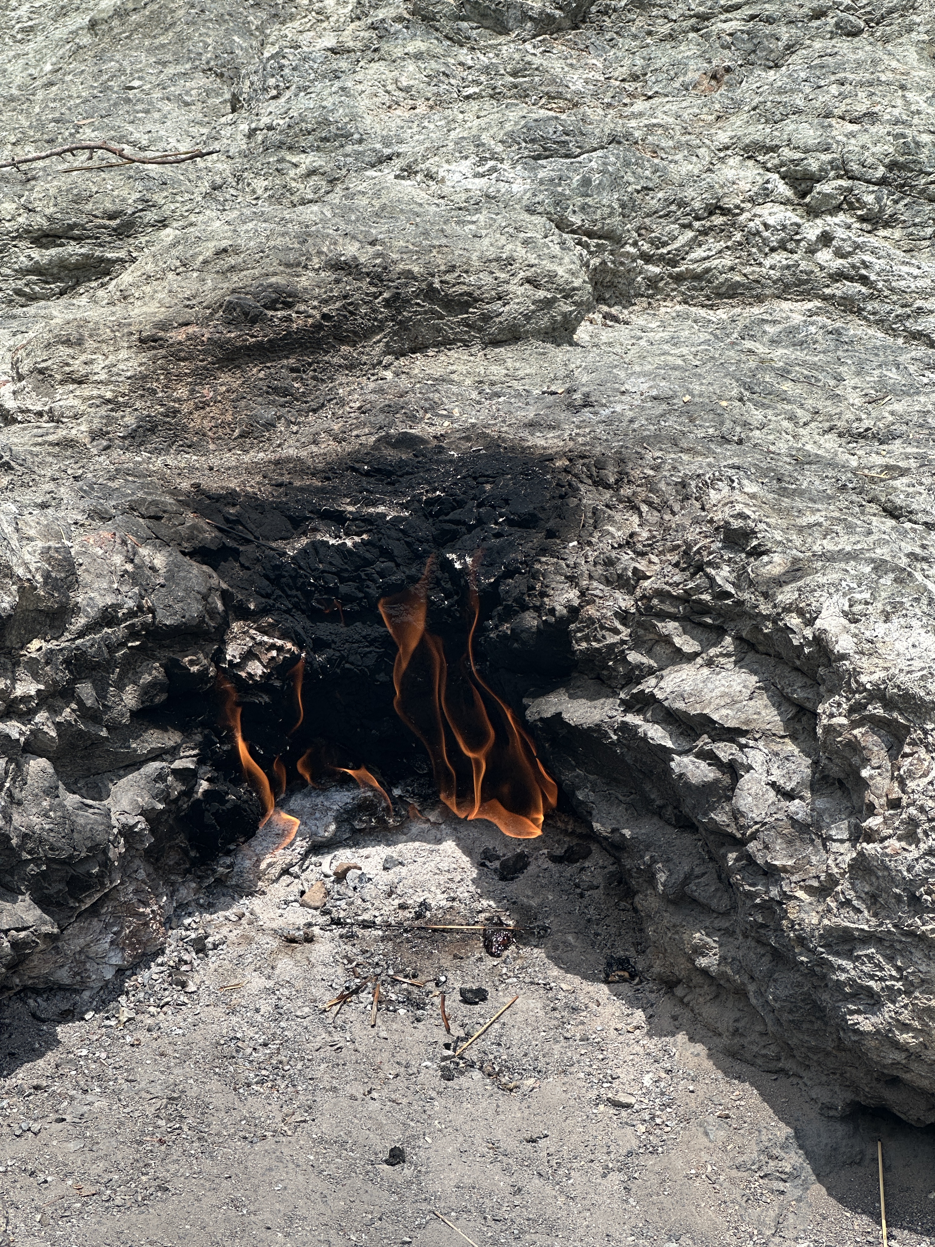 Doch wie entsteht das Feuer? Es sind Erdgase, die hier aus Rissen und Spalten entweichen und sich entzünden.