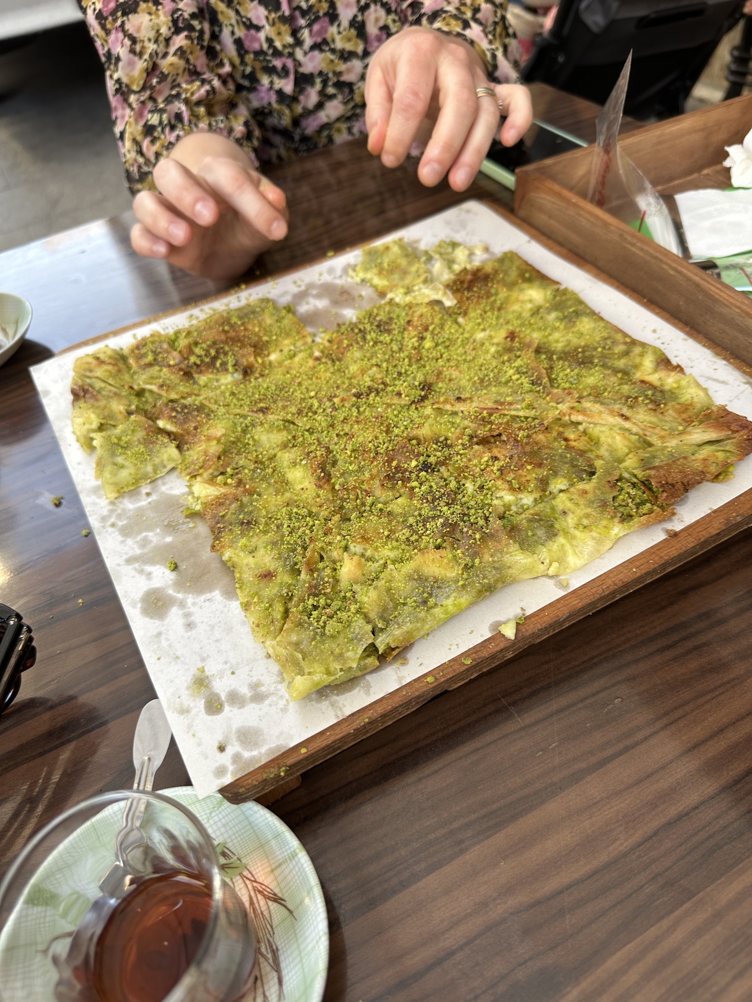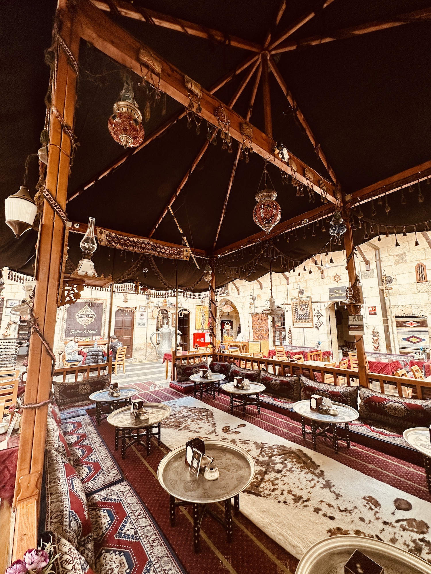 Die Stadt ist beliebt bei Historikern, Naturforschern und Schleckermäuler – wir zählen zu Letzterem. Laut einer der Versionen wurde die Stadt 3650 v.u.Z. gegründet – viele Wissenschaftler glauben das die Stadt noch viel älter ist. Im armenischen Viertel von Gaziantep gibt es einige bunte Kaffees, leider haben viele davon geschlossen und müssen nach dem Erdbeben renovieren. Wir suchten uns das bunteste aus und haben mal wieder Chai getrunken. Die Innenstadt ist voller kleiner Geschäfte, man weiß nicht, wo man zuerst hinschauen soll. Es gibt Klamotten, Klamotten, Klamotten und dazwischen ganz versteckt einen „Katmer“-Geheimtipp. Katmer ist eine Süßspeise aus einem sehr alten Rezept. Blätterteig, Pistazien und Schmand. Dazu wird Milch serviert. Es ist göttlich und himmlisch und einfach unfassbar lecker. Die Einheimischen essen es gerne zum Frühstück.
