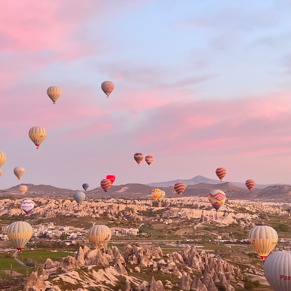 Zugegeben: So sprachlos war ich bisher selten, es ist so faszinierend. Der Himmel übersät mit bunten Ballons in Kombination mit der einmaligen Landschaft Kappadokiens dem Sonnenaufgang und den verschiedenen Himmelsfarben.