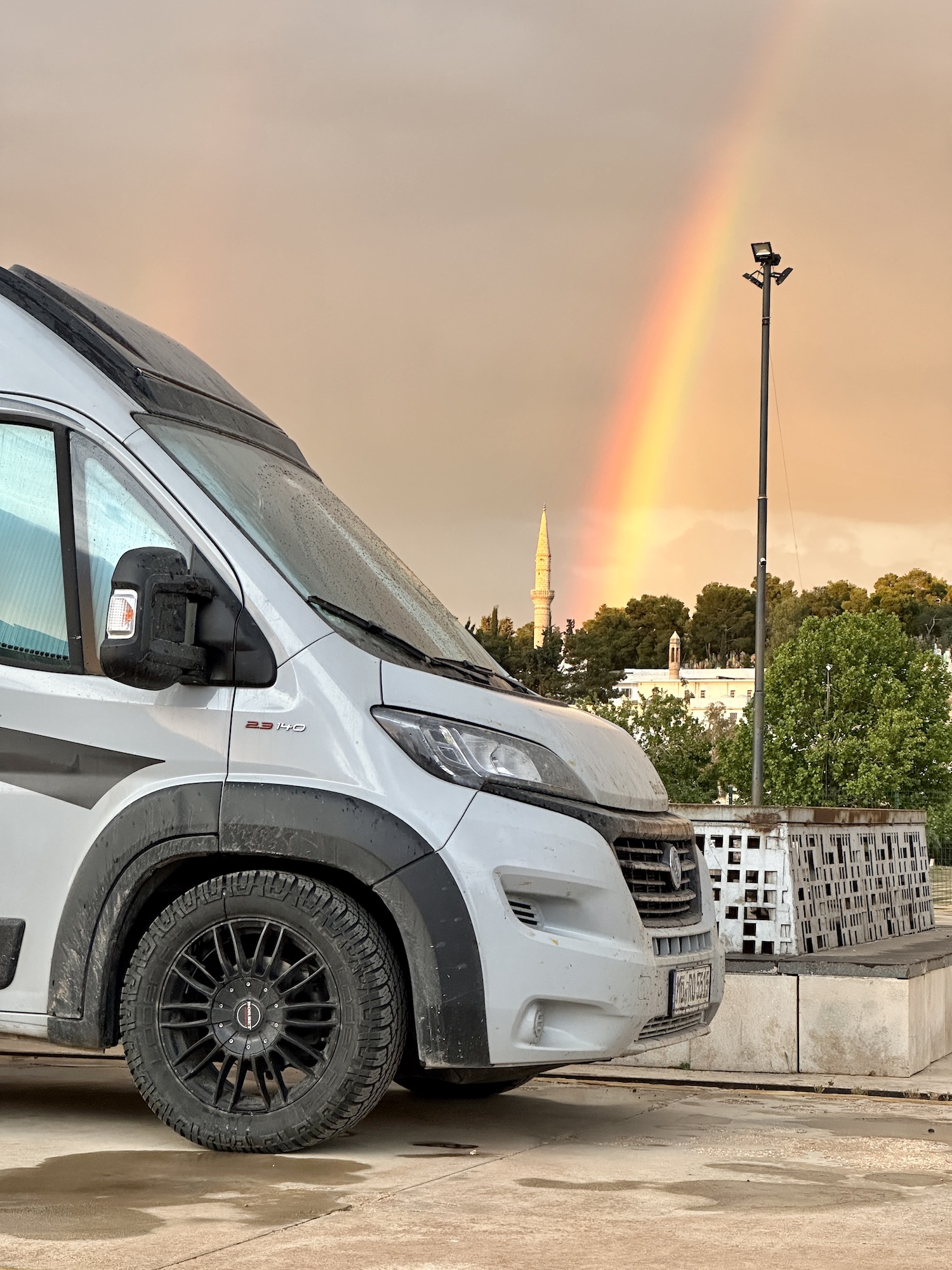 Sanliurfa gilt als Perle Südostanatoliens und wird auch als „ruhmreiche Prohetenstadt Urfa“ bezeichnet. Sanliurfa ist die fünftheiligste Stadt des Islam und auch ein sehr bedeutender Wallfahrtsort, denn hier soll Abraham geboren und gelebt haben. Wir standen auf einem riesigen Parkplatz vor dem archäologischen Museum, da der Parkplatz den wir uns auf Park4Night markiert haben, aufgrund eines Wasserschaden gesperrt wurde. Dafür mit Regenbogen.