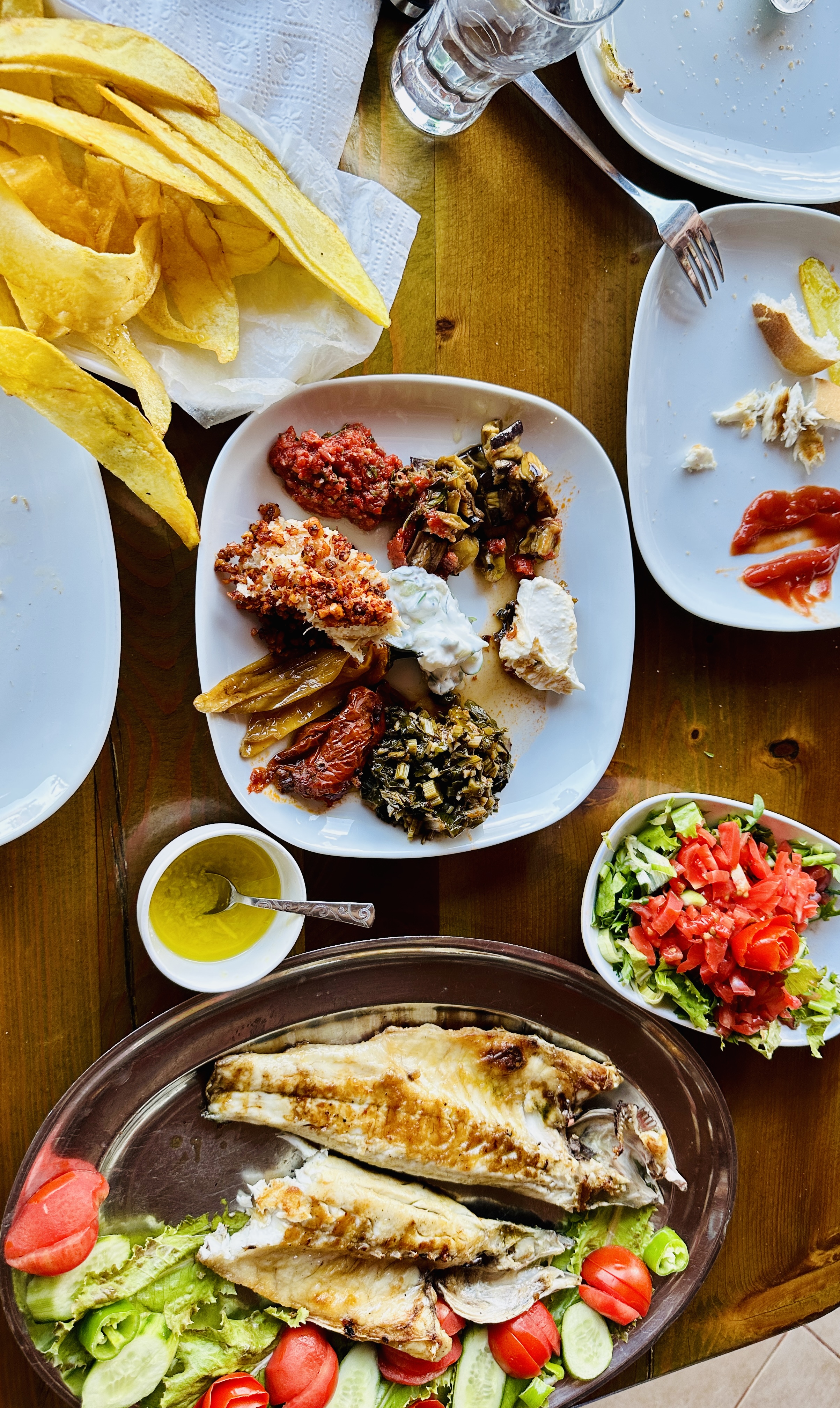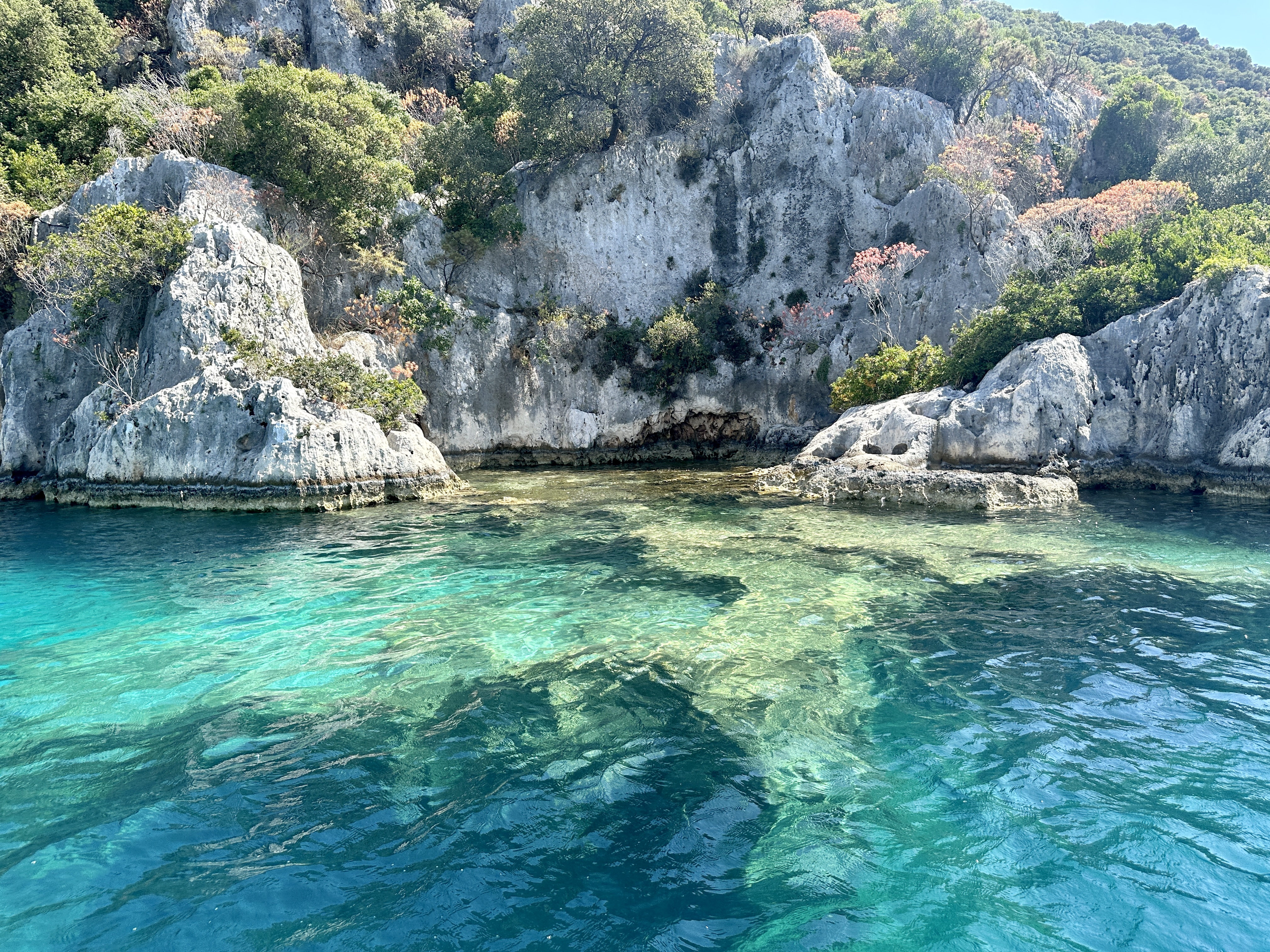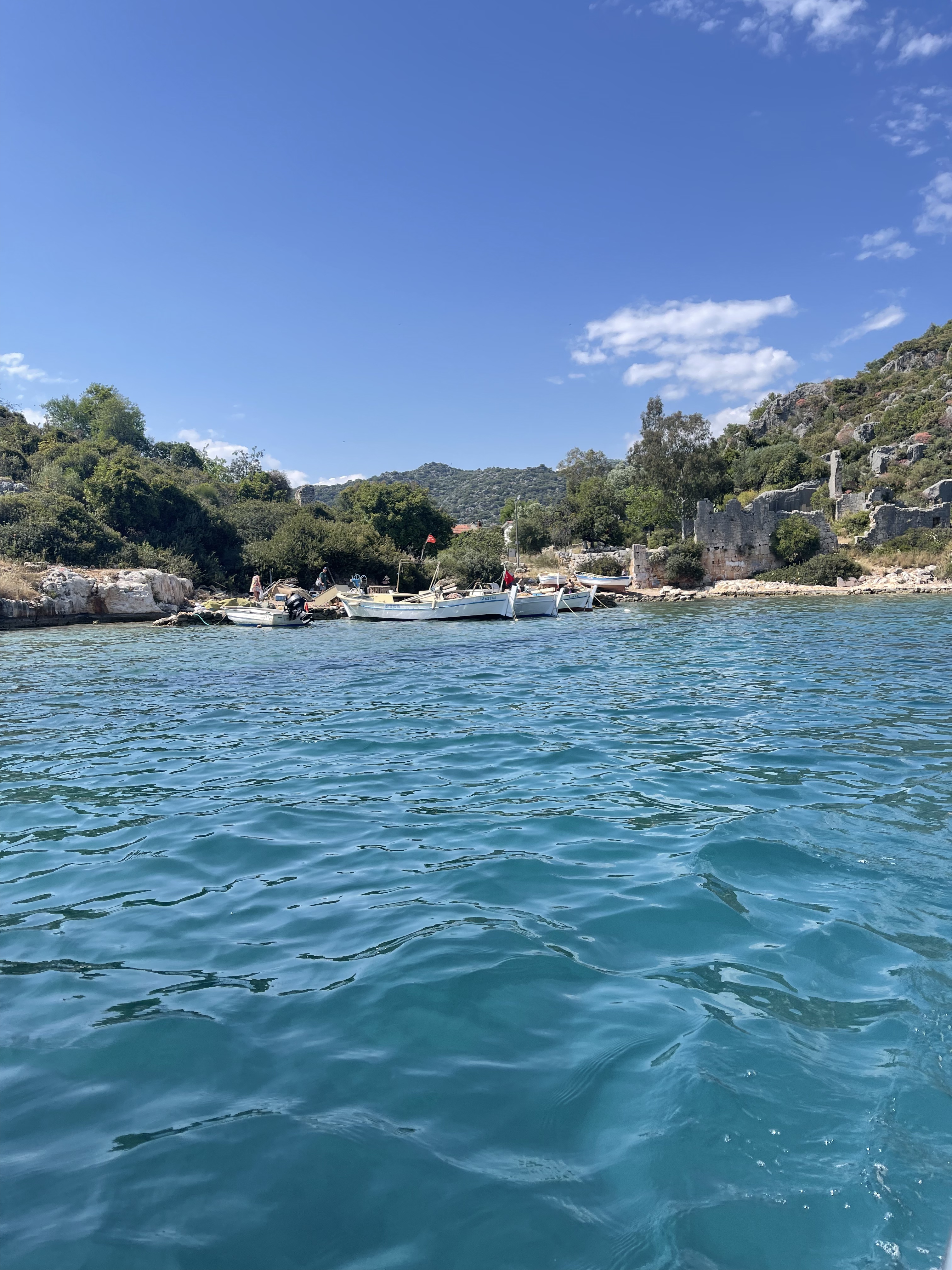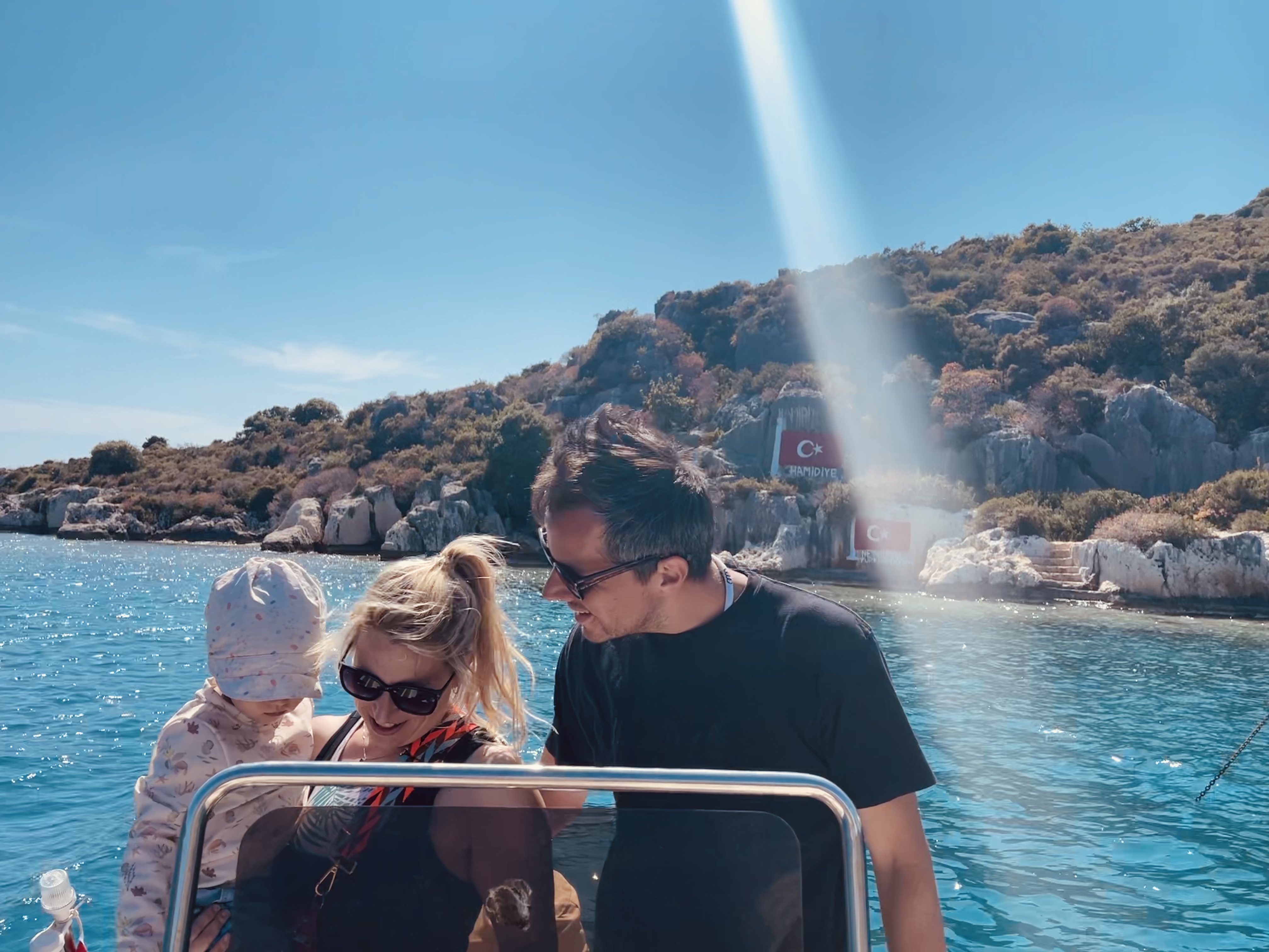 Also, Chris war im Dorf und dachte Fleur und ich machen Mittagsschlaf…er gönnte sich einen Chai und quatschte ein wenig mit Hassan – dem Restaurant-Besitzer. Wie sich im Nachhinein rausstellte, ist er eine Institution, die in sämtlichen Reiseführern und in der Geo Saison (so so schade das es sie nicht mehr gibt – ich liebte sie) und unter Seglern bekannt ist. Er fragte uns, ob wir auch eine Bootstour machen wollen, denn seine Tochter könnte uns mit seinem privaten Boot zur Insel Kekova bringen und wir könnten uns dort die „Versunken Stadt“ ansehen. Na klar wollten wir das. Los ging die Bootstour. Am Anfang hatte Fleur ein wenig Schiss, denn Hassans Tochter gab auch echt Gas (Motorboot). Die Angst legte sich relativ schnell, als wir an der versunken Stadt angekommen sind und langsam an der Küste entlang fuhren. Hassans Tochter erklärte uns, wo wir unter Wasser ein Haus erkennen können, wo der Basar der Stadt war und so weiter. Sie kennt wirklich jeden Stein :). Nach der einstündigen Bootstour haben wir bei Hassan richtig reingehauen. Hassan kocht alles frisch und selbst und das Restaurant ist zurecht so bekannt – es war einfach saugut.